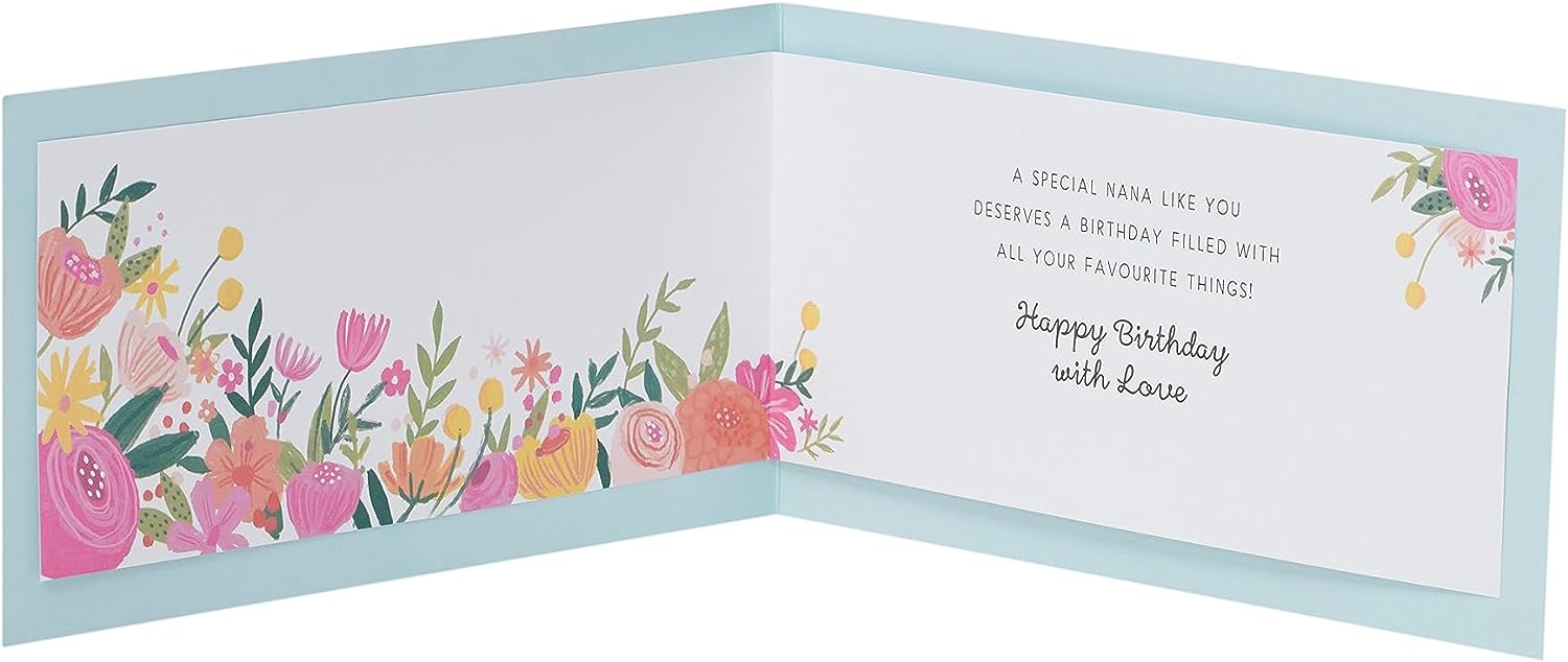 Wish your nana a birthday that’s as special as she is with this lovely landscape card featuring floral lettering and accented with gold foil. Message Inside Reads: A special nana like you deserves a birthday filled with all your favourite things! Happy Birthday with Love. Card Size: 229mm x 121mm. Envelope Included.