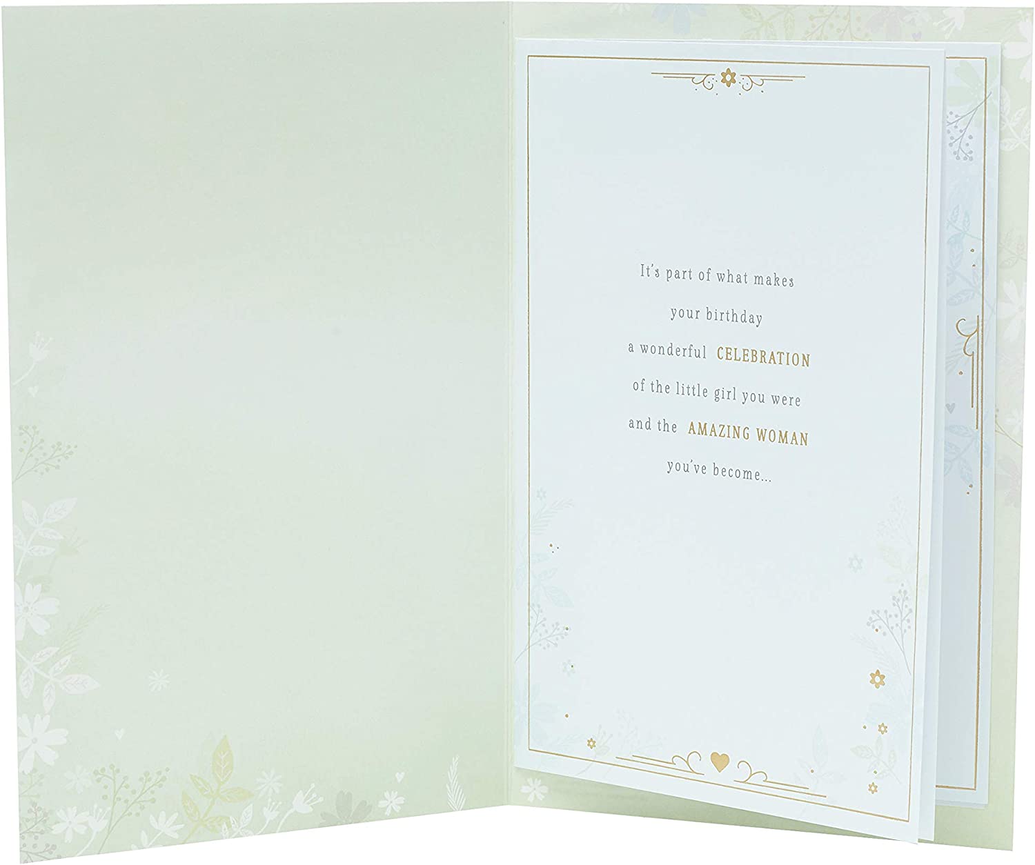 Relive special memories on your Daughters birthday with this sentimental and heartfelt card. Inside Message: It's part of what makes your birthday a wonderful celebration of the little girl you were and the amazing woman you've become... Envelope Included. Card Size: 165mm x 254mm.