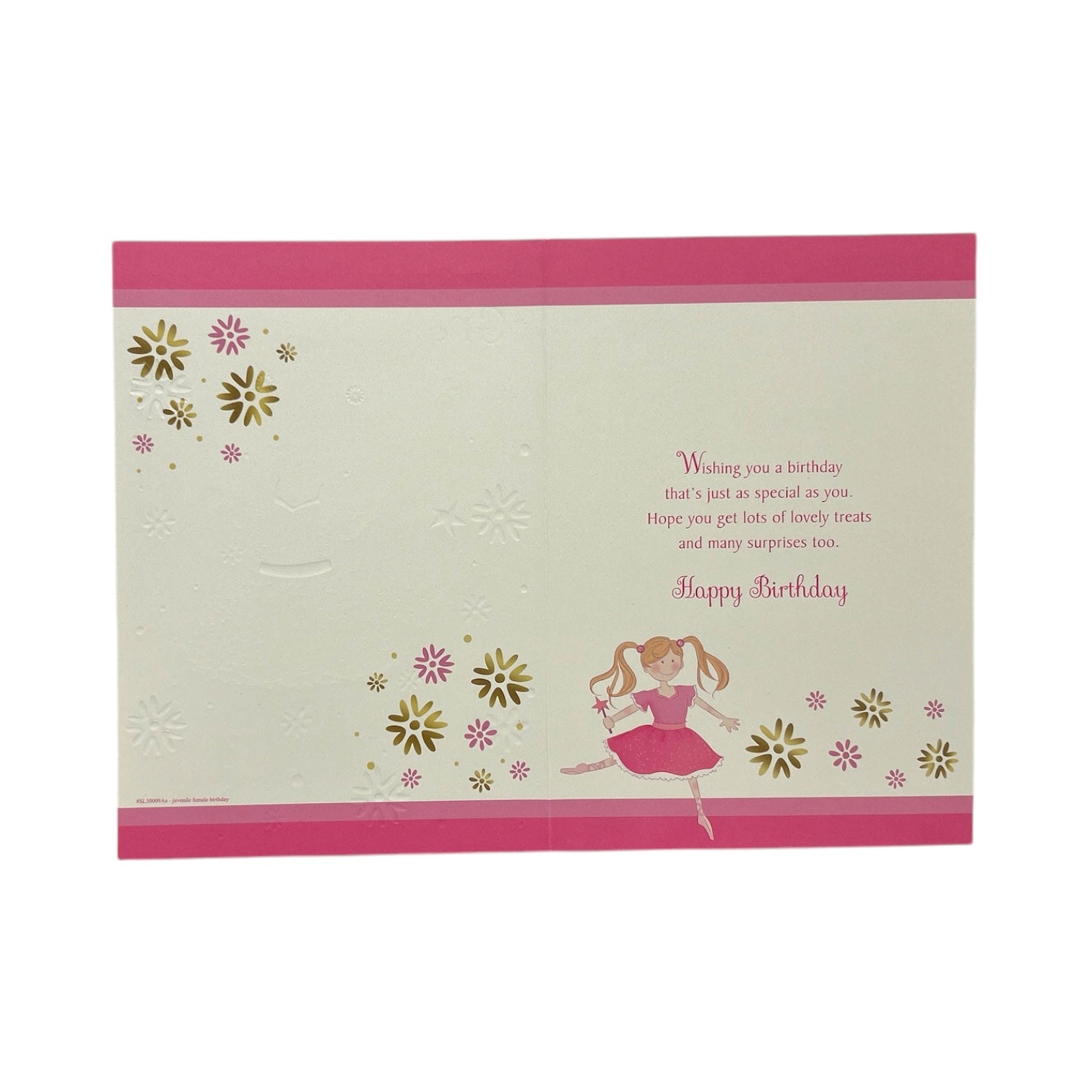 This beautiful birthday card for a Granddaughter features an adorable young girl in a pink ballerina dress, captured in a playful, dance-like pose with her arms outstretched and holding a magic wand. The soft, light beige background is delicately adorned with small gold-embossed flowers, creating a harmonious and elegant design that mirrors the floral elements in the foreground. The playful and magical essence of the card makes it a perfect choice to celebrate your Granddaughter's special day. Inside, heartfelt birthday wishes complete this thoughtful and charming greeting. The card comes with a coordinating envelope. Card size: Approx. 19.5 x 14 cm.