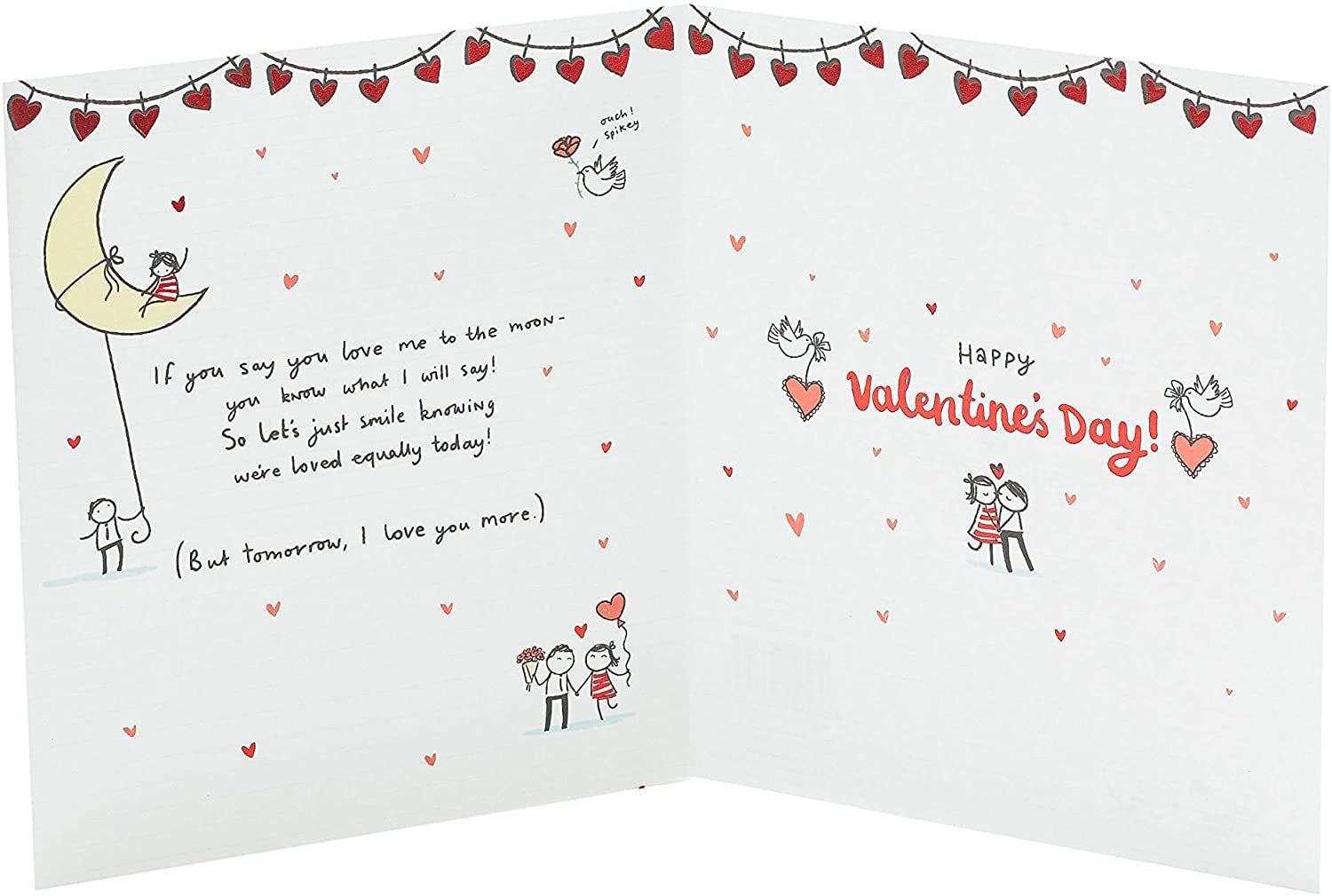 This one I love Valentine's Day card with its cute cartoon design is perfect to send to him or her this romantic season. Message inside reads: If you say you love me to the moon - you know what I will say! So let's just smile knowing we're loved equally today! (But tomorrow, I love you more.) Happy Valentine's Day! Card size: 159 x 184cm. Envelope included.