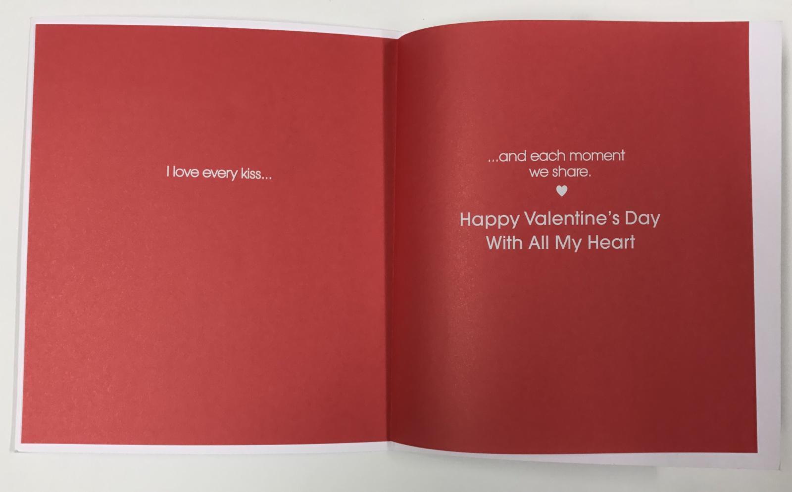 This sweet, photographic, glittery Valentine's card featuring two adorable, kissing kitten and puppy makes a lovely way to tell your wife you love her! The card comes with an attached red sheet, and a special message in the inside. Cover Wording...For My Wife. Inside Wording... I love every kiss.. and each moment we share. Happy Valentine's Day With All My Heart. Supplied with a burgundy envelope.