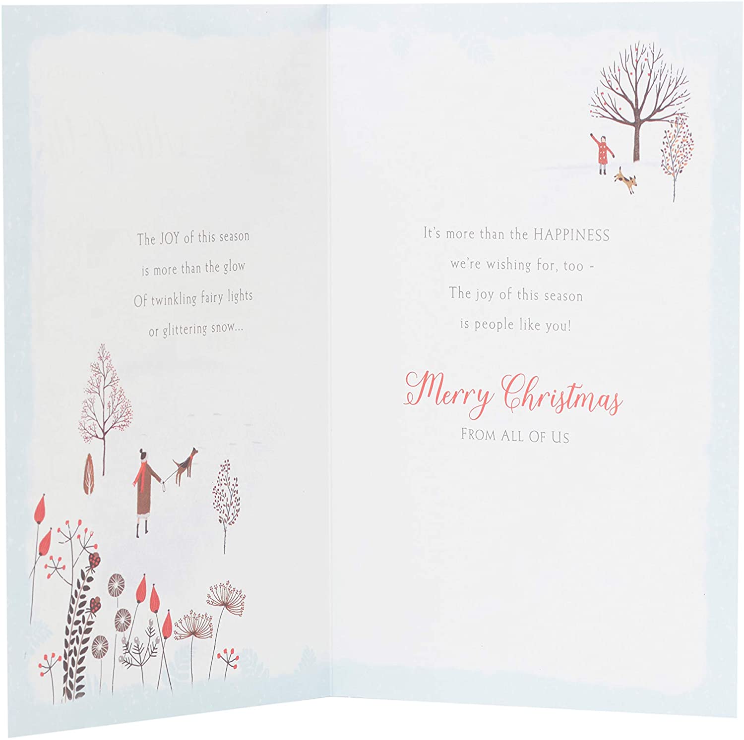 Christmas Wishes From All of Us Beautiful Winter Scene Design Christmas Card. Inside Wording: The joy of this season is more than the glow Of twinkling fairy lights or glittering snow... It's more than the happiness we're wishing for, too The joy of this season is people like you! Merry Christmas from All of Us. Approx Size: 137 x 210mm.