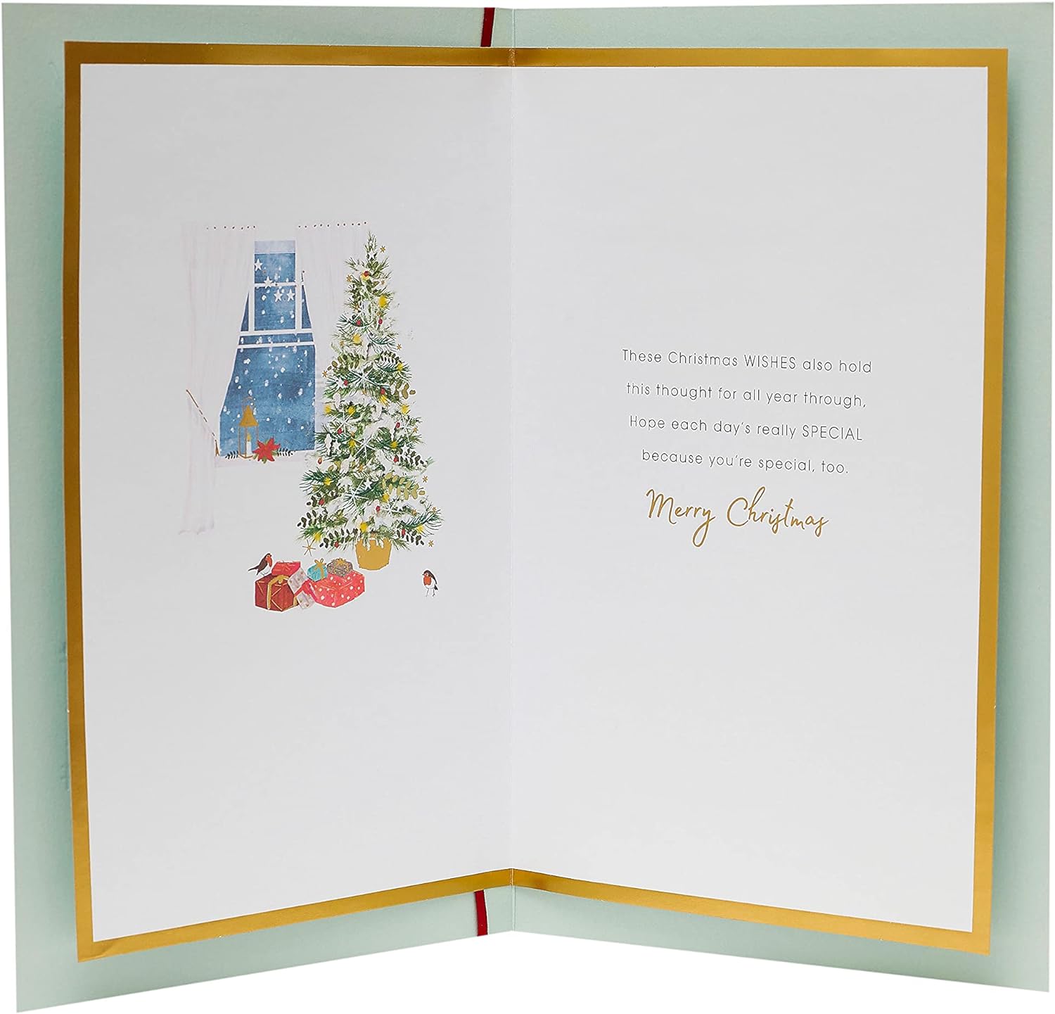 Send warm Christmas wishes to someone special with this card, featuring a front door scene finished with gold foil, a star gem and red ribbon. Message Inside Reads: These Christmas wishes also hold this thought for all year through, Hope each day's really special because you're special, too. Merry Christmas. Envelope Included. Card size: 165mm x 254mm.