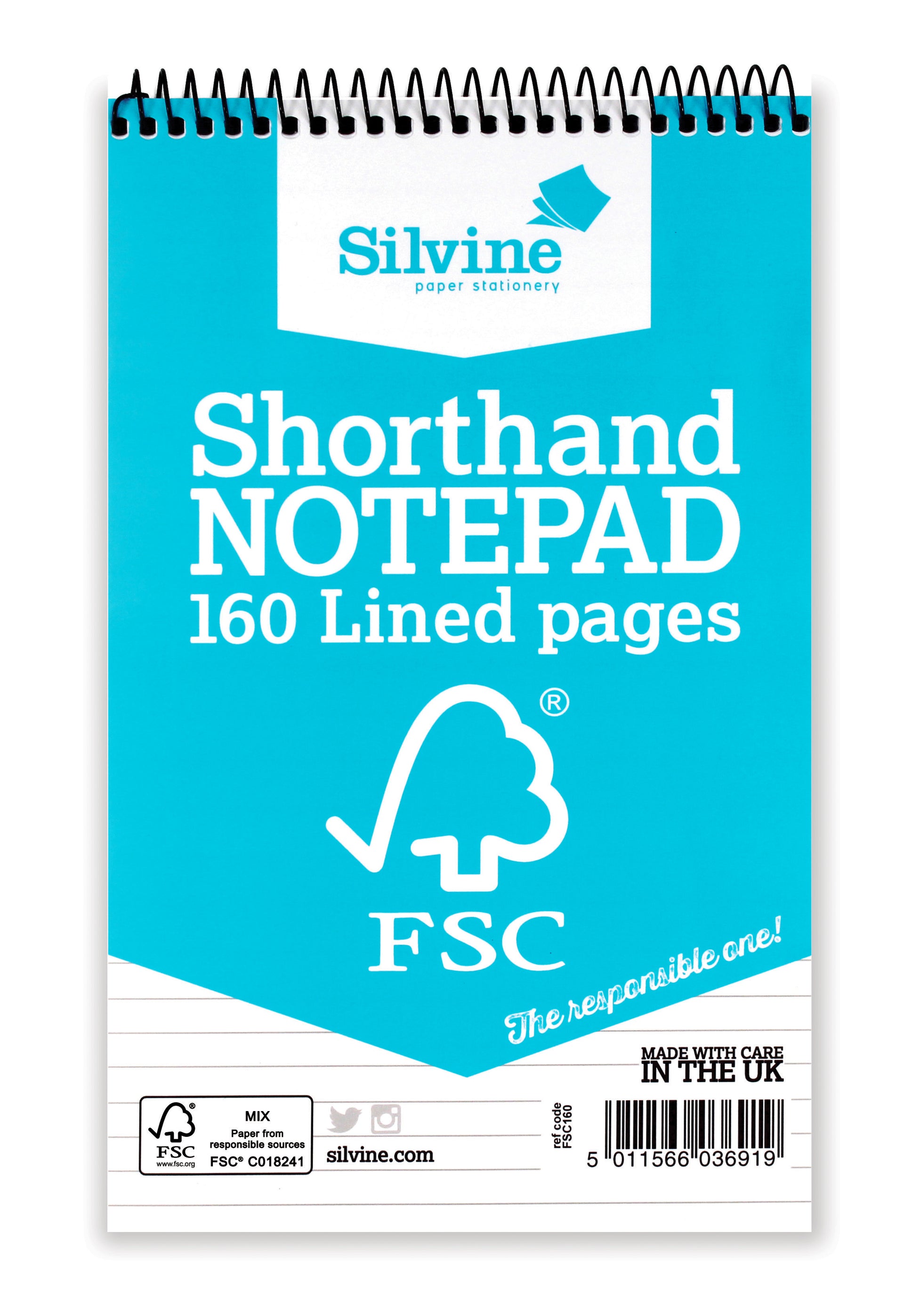 Silvine FSC Certified Shorthand Wirebound Notepad. Approx Size: 127x203mm. The Silvine Shorthand Spiral Notepad is a handy little pad great for simple not taking. Containing 160 pages of quality ruled feint lined paper. This compact feint lined shorthand notepad is perfect for the professional around the office who needs to take notes for meetings etc. Neatly wire bound together, this mechanism allows you to flip over pages making it easier to continue note taking without having you desk cluttered with multiple pieces of paper scattered around.
