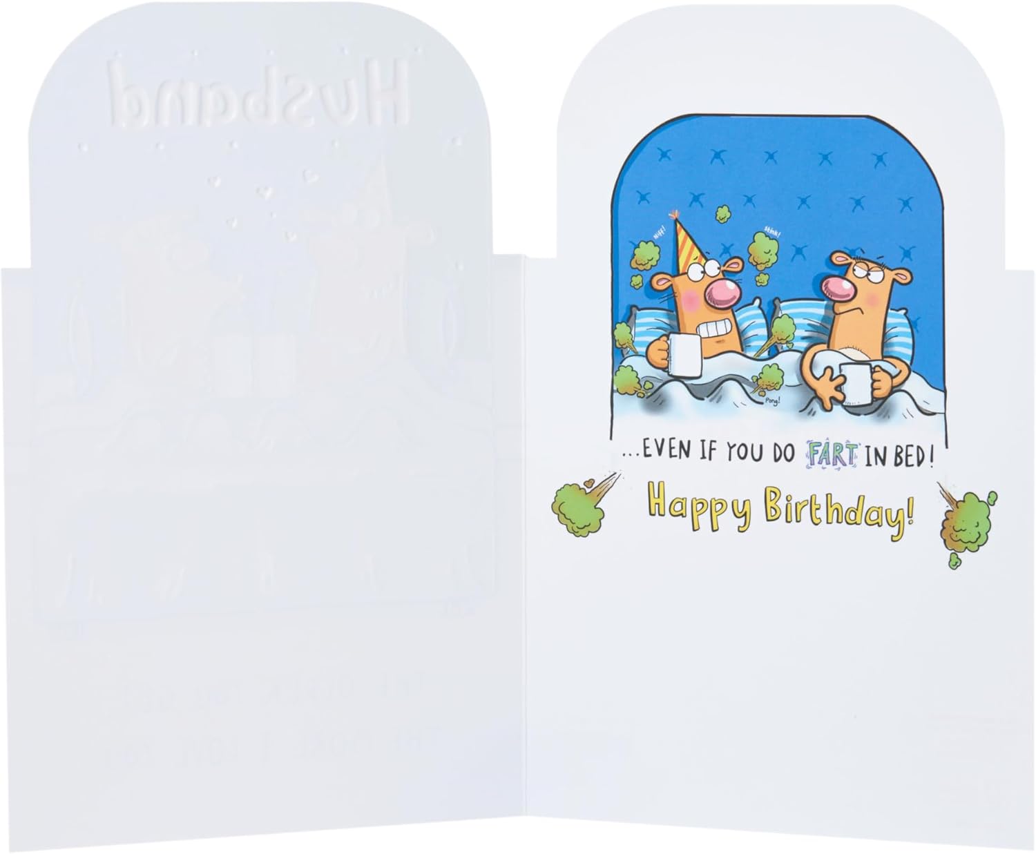 Celebrate your husband despite his farting with this funny birthday card. Featuring a silly cartoon, it’s accented with embossed details. Message Inside Reads: ...even if you do fart in bed! Happy Birthday! Card Size: 14.9cm x 22.9cm | Envelope Included