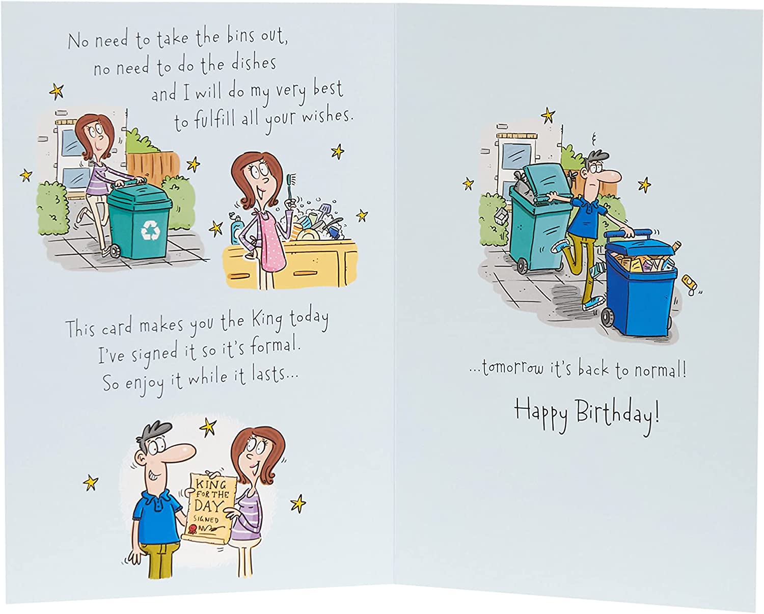 A classically illustrated birthday card for your husband that features fun married characters and a sweet poem that lets him know that today (and only today) he will be treated like a king! Message Inside: ...tomorrow it's back to normal! Happy Birthday! Card Size: 149mm x 229mm. Envelope Included.
