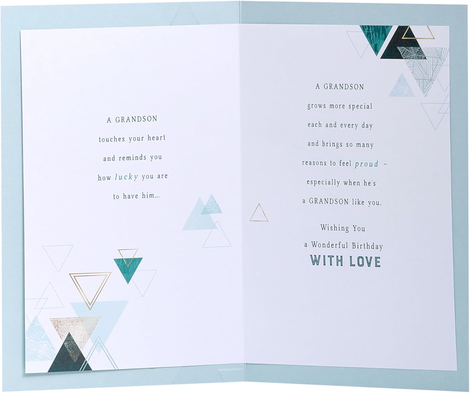 Tell your grandson how proud he makes you with this birthday card, featuring a heartfelt message and a geometric design finished with gold foil. Message Inside Reads: A grandson grows more special each and every day and brings so many reasons to feel proud - especially when he's a grandson like you. Wishing You a Wonderful Birthday with Love Card Size: 14.9cm x 22.9cm | Envelope Included