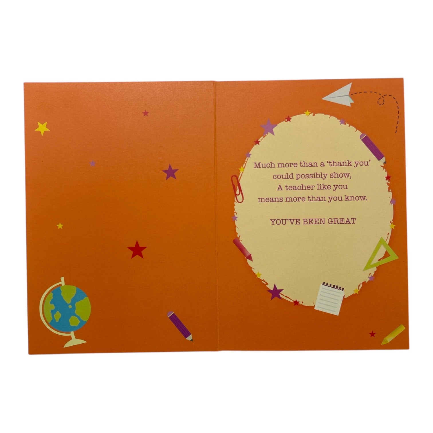 This good luck greeting card is designed to encourage and support someone starting at a new school. The front of the card has a blue background with a white circular center, decorated with educational symbols such as a globe, stationery, mathematical tools, and stars. This card is perfect for wishing someone success and confidence as they embark on a new school journey. Comes complete with a coordinating envelope. Card size: Approx. 19.5 x 14 cm.