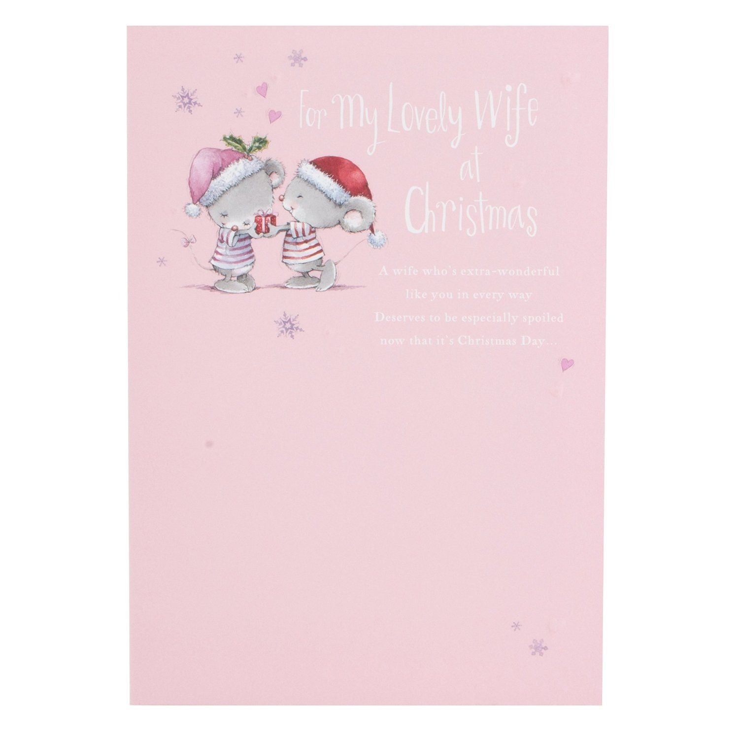 These cute characters, from Hallmark's Dylan and Friends range, are guaranteed to make your wife smile at this very merry season! Message on the front reads: For My Lovely Wife at Christmas A wife who's extra-wonderful like you in every way Deserves to be especially spoiled now that it's Christmas Day...  Message inside reads: But there could never be a gift quite nice enough it's true To show how very grateful I am that I've got you! Happy Christmas With Lots of Love This quality, medium sized card features an adorable mouse couple sweetly exchanging a gift, surrounded by charming snowflake illustrations and tiny, embossed hearts. The inside reveals a striking red and white polka dot finish. A lovely Christmas card for a lovely wife! Box Contains 1 Card 1 Envelope