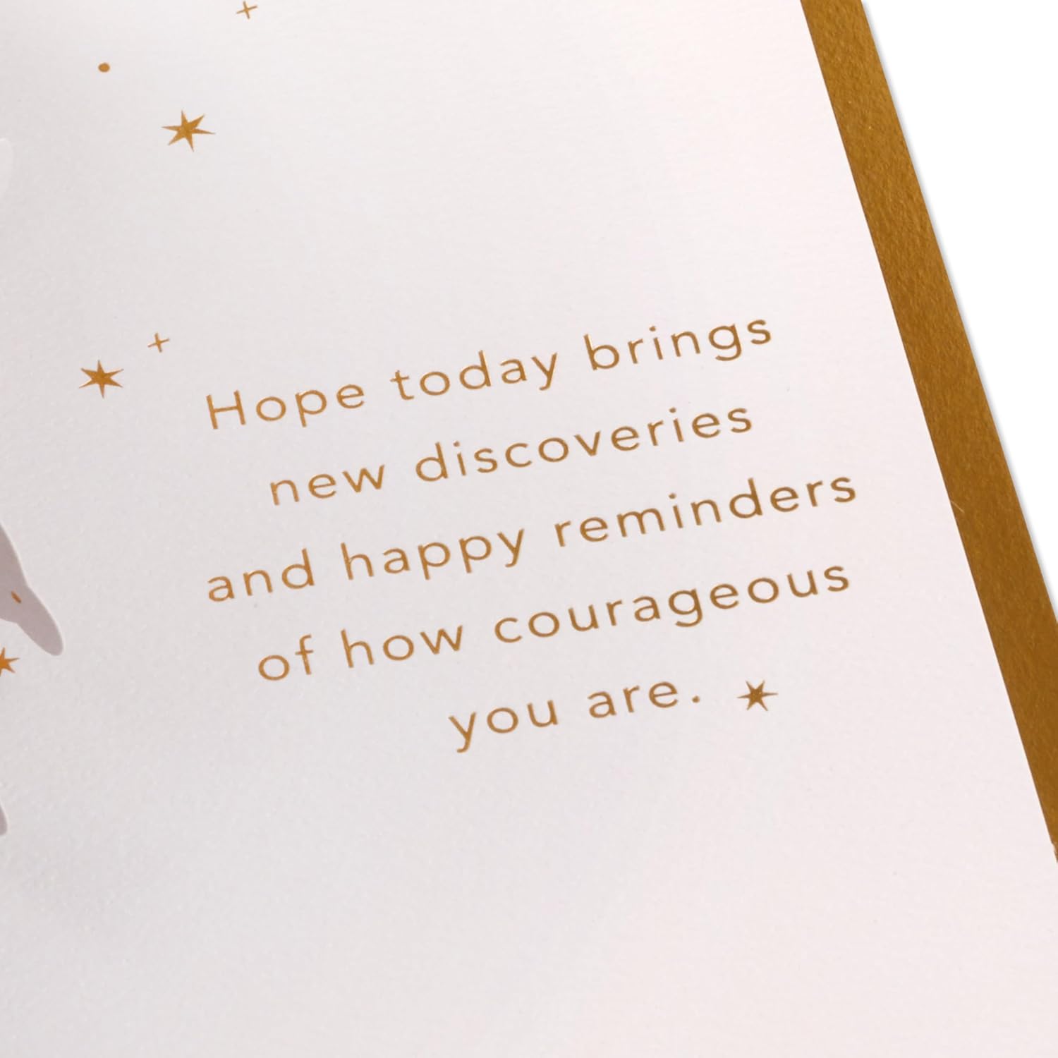 Encourage your favourite wizard to have the most enchanting day, with this spellbinding Harry Potter 3D and pop-up card from Hallmark, perfect for birthdays, graduations, or just because you want to gift them some magic. Reveal a 3D and pop-up display of Harry Potter riding his broomstick, with the Hungarian Horntail dragon from the Tri-Wizard tournament in Harry Potter and the Goblet of Fire. This card features die-cut details and metallic gold foil. This card is fully recyclable, and made of material from well-managed, FSC-certified forests and other controlled sources. Use the space provided to write your own magical message to accompany our Harry Potter themed message, ‘Hope today brings new discoveries and happy reminders of how courageous you are’, and make their day spellbinding. Flat card measures 11.9cm by 17.3cm, 3D card measures 6.5cm by 23.8cm by 17.3cm when opened to display. Accompanied by a co-ordinating Hallmark Signature branded, white envelope with metallic gold foil. Within UK 'Large Letter' Postage Size Limits. Sending a Harry Potter greeting card is a magical way to connect with fellow fans of the wizarding world. Whether it’s for a birthday, a special occasion, or just to brighten someone’s day, a Harry Potter card brings a touch of enchantment.