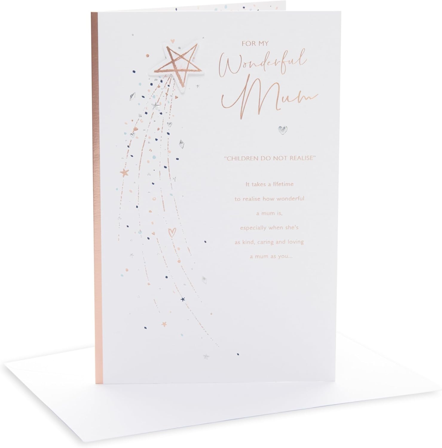 The heartfelt message on this beautiful shooting star card will let Mum know just how much she means on her birthday. It's printed on premium quality board with copper and silver foil details and 3D star. Message Inside Reads: The older I grow the more I realise how lucky I am to have a mum who always wants the best for me, and is there with love and support no matter what... Card Size: 16.5cm x 25.4cm | Envelope Included