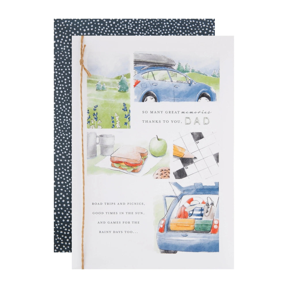 Have a Father's day your amazing dad deserves and send him lots of heartfelt words to show your appreciation with this stunning card. The perfect way to make his day even brighter. Printed on high quality board, this Father's day card features embossed elements, metallic silver foil details, a brown paper twine embellishment, a paper insert and comes complete with a Hallmark branded, grey speckled envelope. This card features the message 'So many great memories thanks to you, Dad. Road trips and picnics, good times in the sun, and games for the rainy days too…' on the front. This card is fully recyclable, and made of material from well-managed, FSC®-certified forests and other controlled sources. Message Inside: Such special memories of family fun thanks to a great dad like you. Happy Father's Day Card measures: H22.8cm by W15.9cm, Within UK 'Letter' Postage Size Limits.