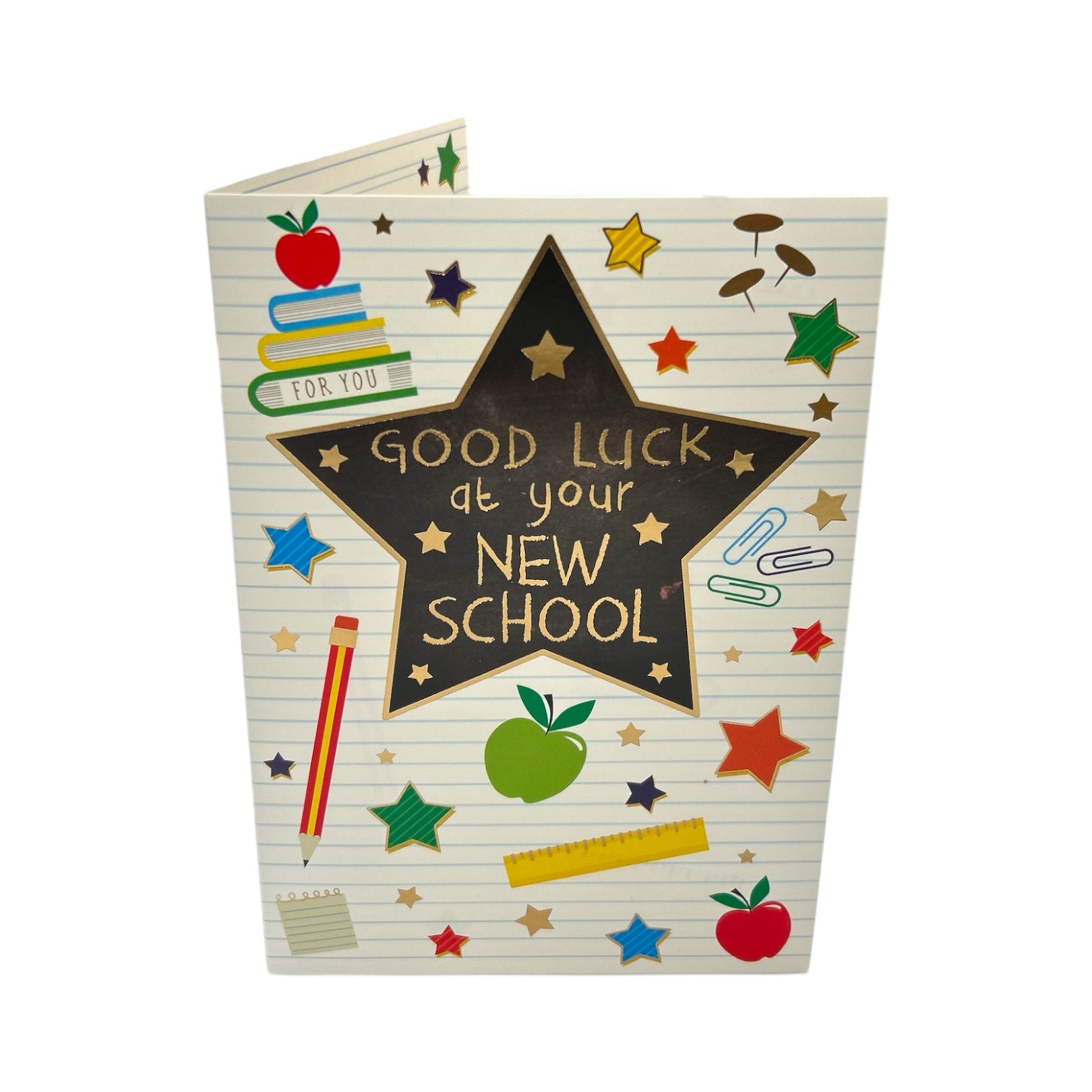 The card is designed to encourage and support someone in new school. The front of the card features a large black star with golden foil details. The background has a light, lined-paper effect, reinforcing the academic theme. The design is bright and cheerful, making it a great card to wish someone good luck! Complete with a coordinating envelope. Card size: Approx. 19.5 x 14 cm.