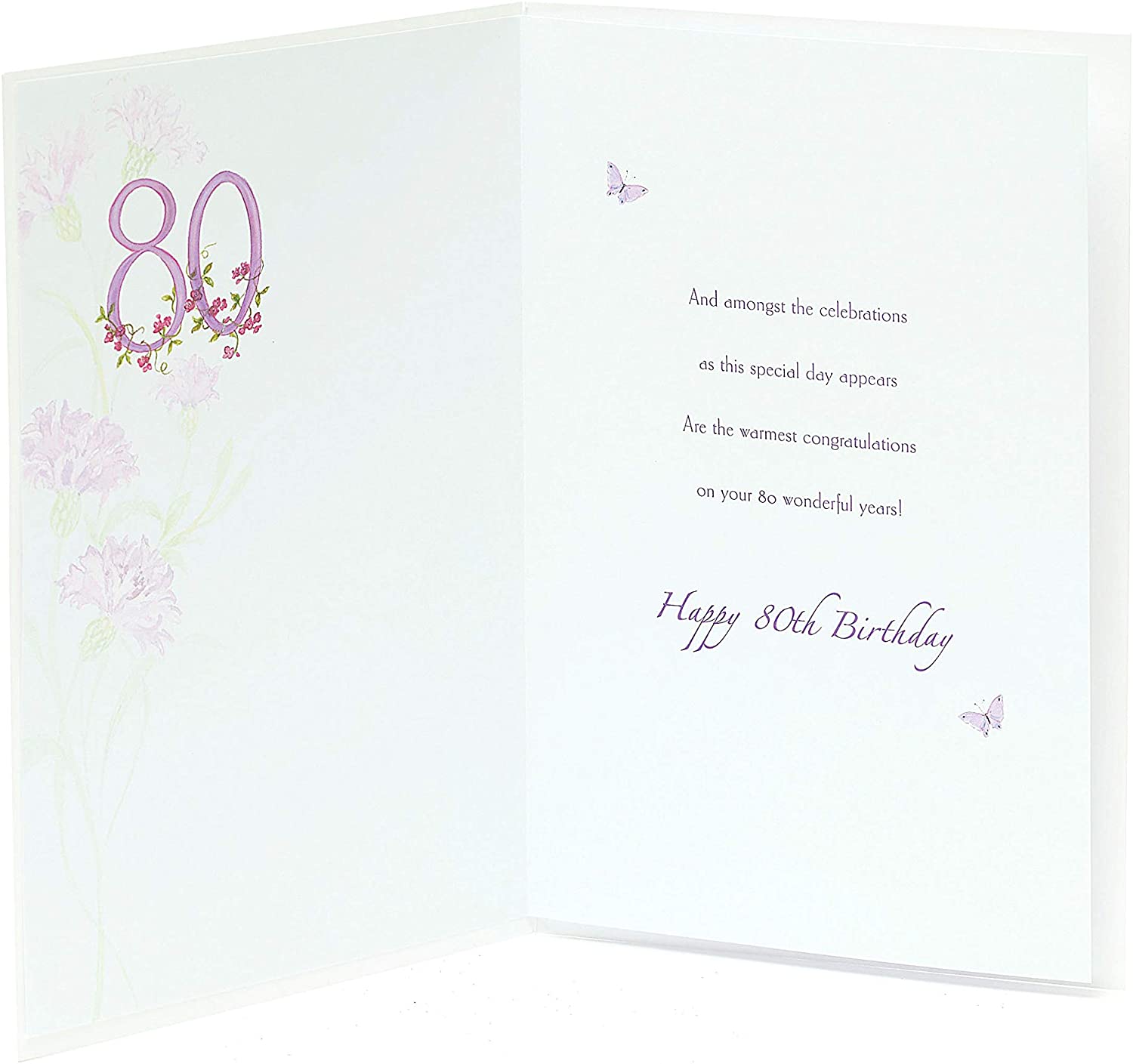 Congratulate them on the milestone of their 80th birthday with this floral card, featuring a warm rhyming verse and silver foil details. Message Inside Reads:And amongst the celebrations as this special day appears Are the warmest congratulations on your 80 wonderful years! Happy 80th Birthday. Card Size: 137 x 210mm. Envelope Included.