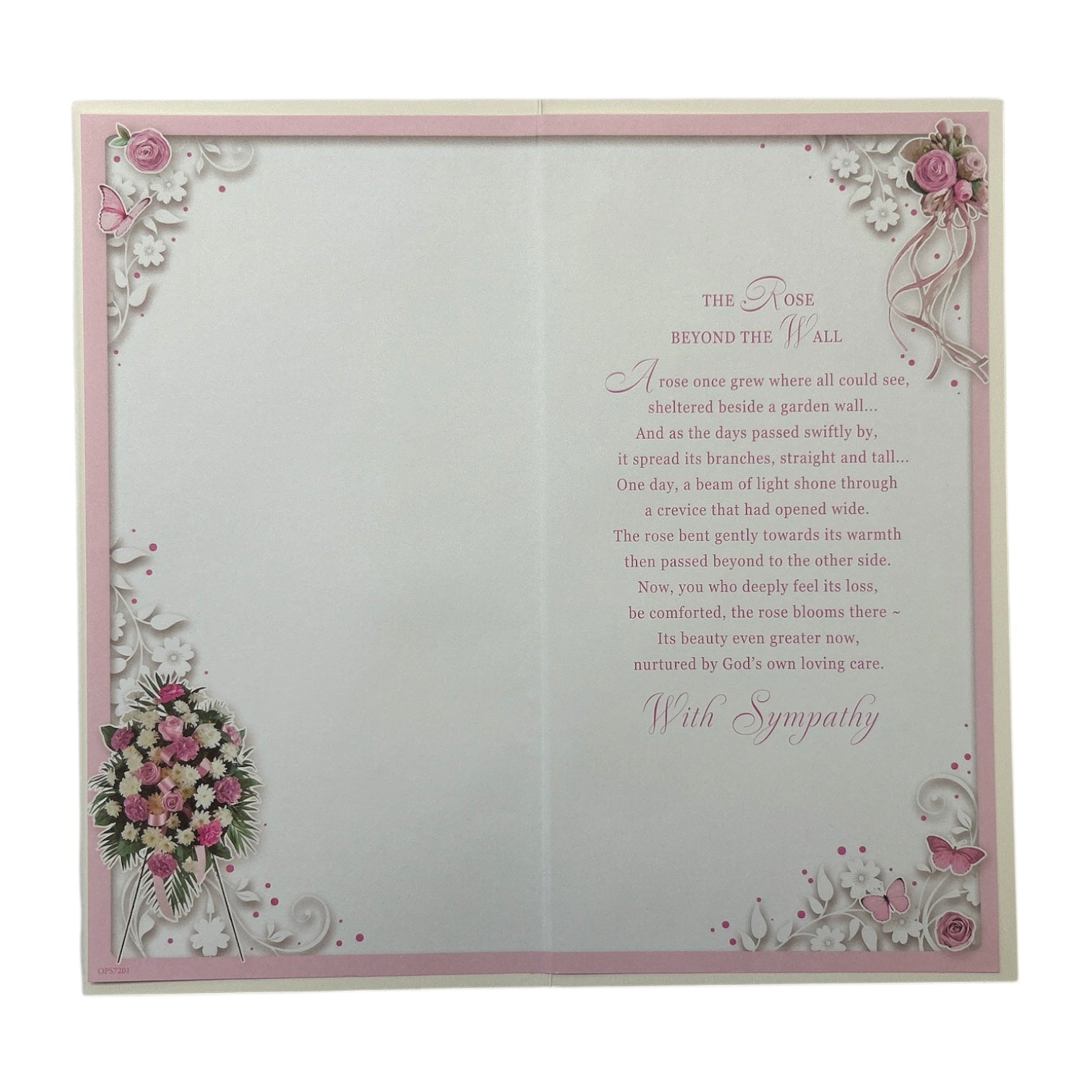 This sympathy card features a soft and comforting design, with delicate floral bouquets and subtle decorative elements to express heartfelt condolences on the loss of a grandmother. Set against a pale cream or white background, the gentle colors and floral patterns create a serene and respectful tone. Small butterflies and elegant detailing complement the blooms, enhancing the card’s sentiment of remembrance and love. The overall design conveys warmth, sympathy, and quiet support during a time of grief. This card measures approximately 12.5 cm x 23.5 cm.