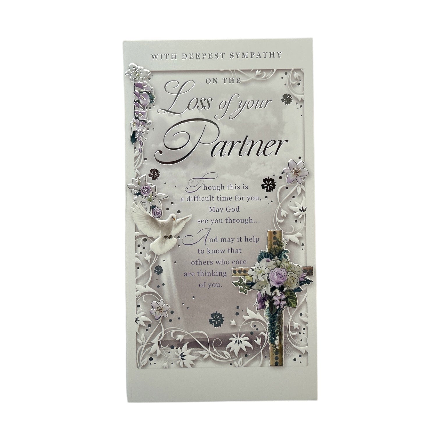This sympathy card gently conveys heartfelt condolences on the loss of a partner. A peaceful dove in flight above a cross symbolizes comfort and hope, while soft floral elements and a lace-like pattern add elegance and serenity. Subtle shading enhances the depth of the design, creating a calm and reflective mood. The text, including "With Deepest Sympathy" and "On The Loss Of Your Partner," is delicately placed, accompanied by supportive and compassionate sentiments. The overall composition offers a graceful tribute, providing comfort during a time of profound loss. This card measures approximately 12.5 cm x 23.5 cm.