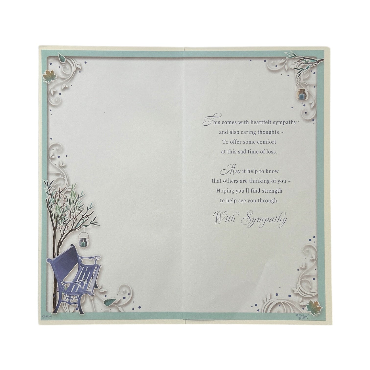 This sympathy card offers a gentle and heartfelt tribute on the loss of a Son. Set against a soft light beige background, the design features a peaceful park bench beneath the branches of a tree, evoking quiet reflection and comfort. The words "With Deepest Sympathy" and "On The Loss Of Your Son" are delicately displayed, accompanied by touching sentiments of support. Subtle detailing and a serene composition create a respectful and soothing message, making this card a meaningful expression of sympathy during a difficult time. This card measures approximately 12.5 cm x 23.5 cm.