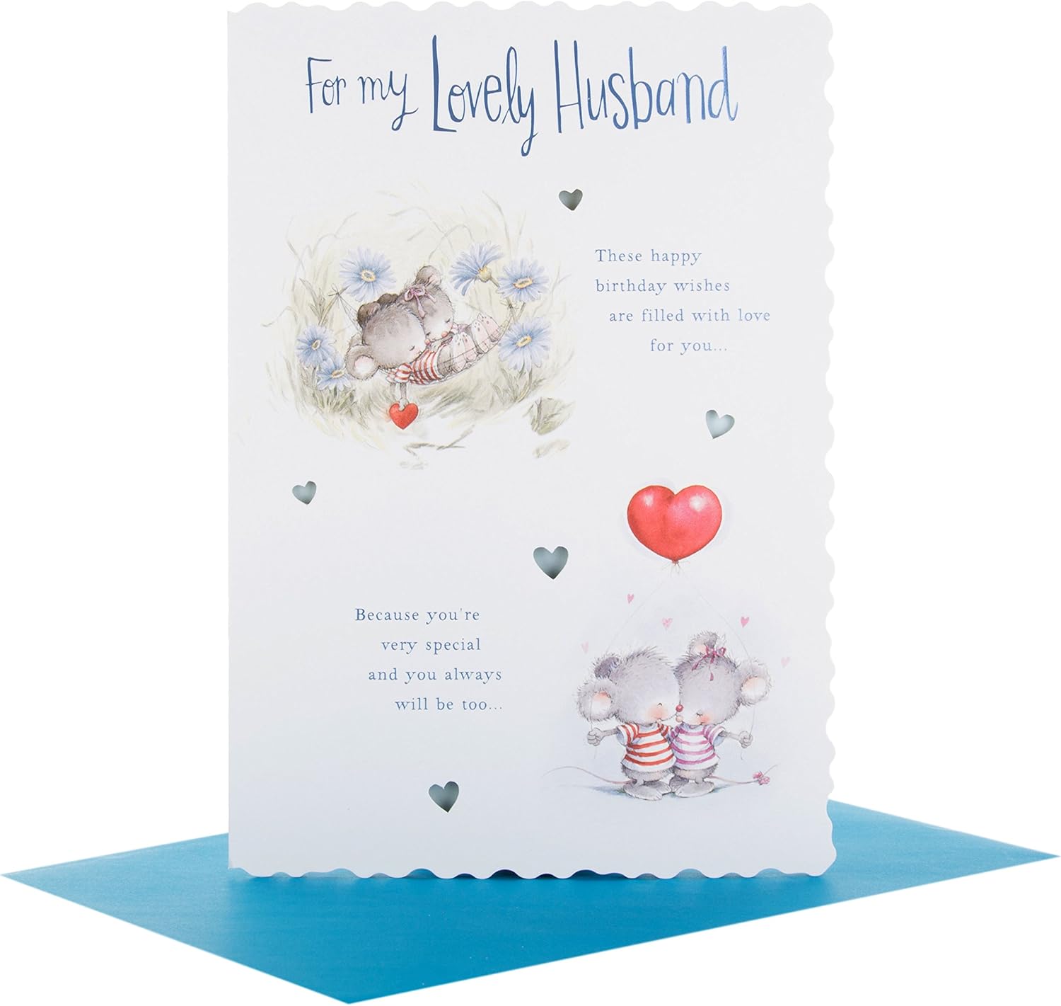 Send Birthday wishes to a lovely Husband with this adorable card from Hallmark. Finishes: Foil Includes: Blue Envelope Royal Mail Postage: Standard Letter Size. Size: 233 x 163mm.