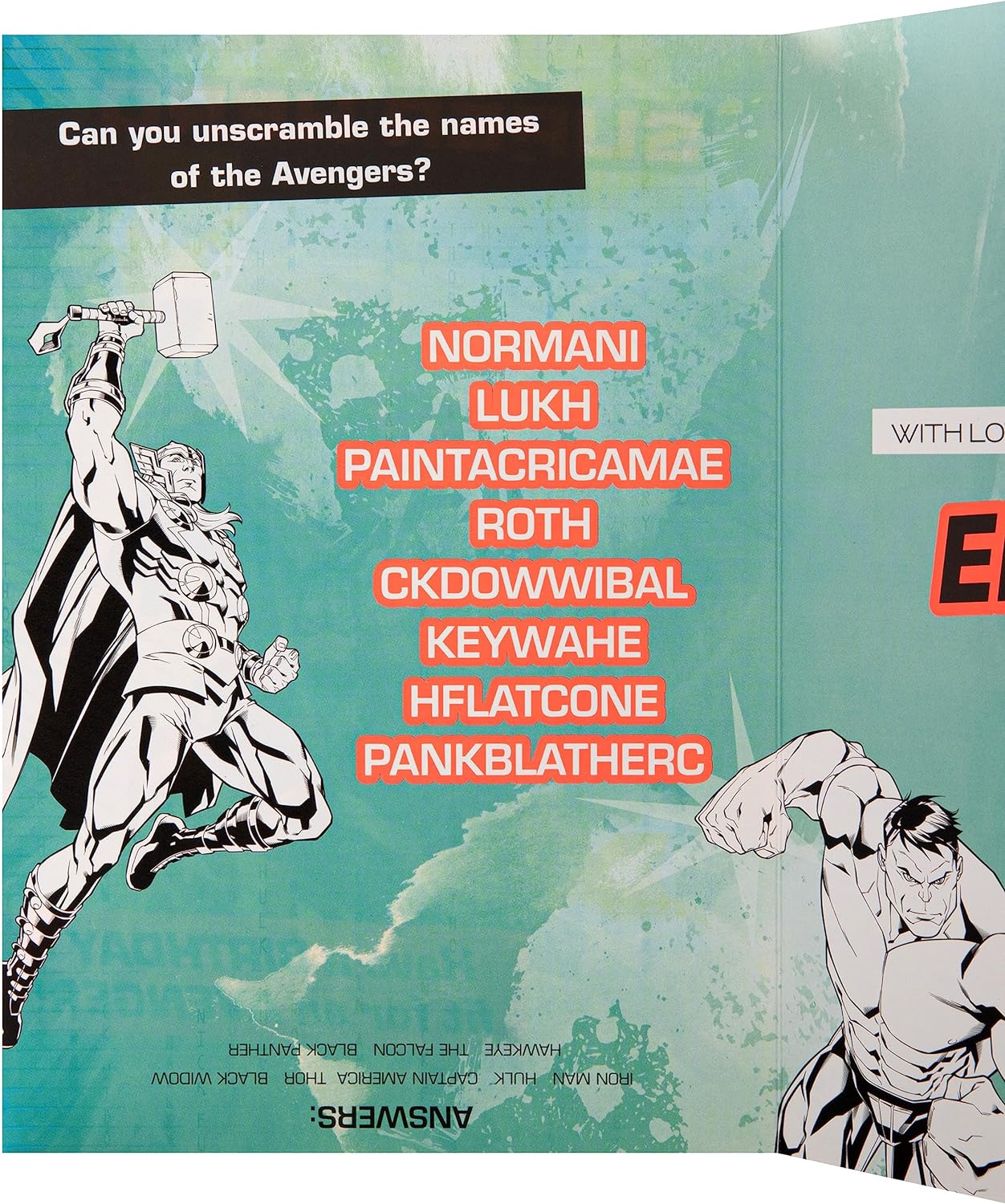 Have a super epic birthday for you son, with this action-packed Marvel Superheroes birthday card, from Hallmark. Printed on high-quality board this card features the characters The Hulk, Captain America, Black Widow Thor, Black Panther and Iron Man, silver foil details, a fun word unscramble activity inside, and comes complete with a co-ordinating blue, Hallmark branded envelope. This product is fully recyclable, and made of material from well-managed, FSC-certified forests and other controlled sources. Message Inside Reads: With love on your epic day! Card Measures: 22.8 cm by 15.9 cm, Within Standard UK 'Letter' Size Limits