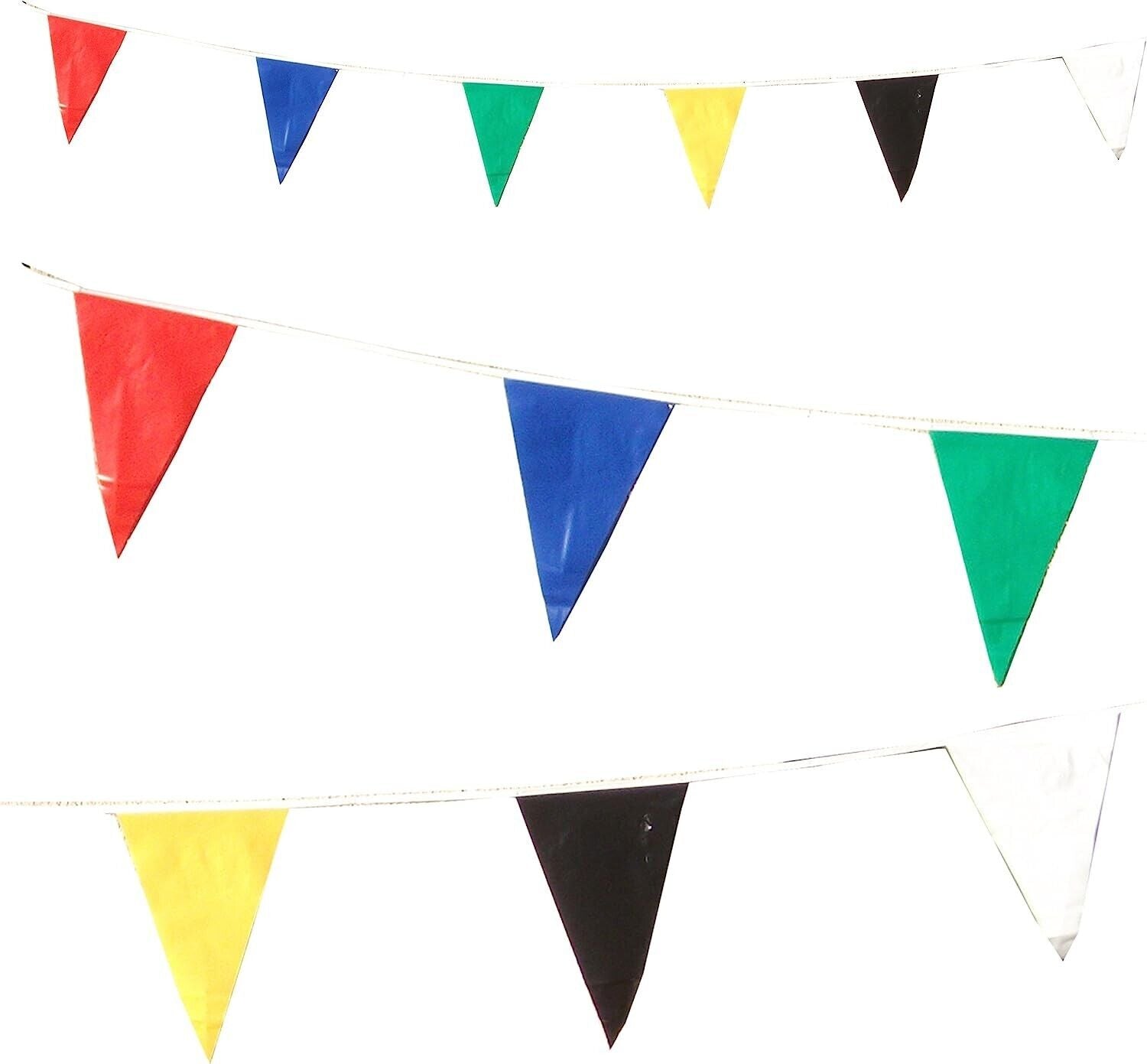 Multi Coloured Bunting 10m with 20 Pennants. This bunting measures 10m and has 20 pennants. Material: PVC. Approx. size of each Flag/ Pennant 30x20cm.