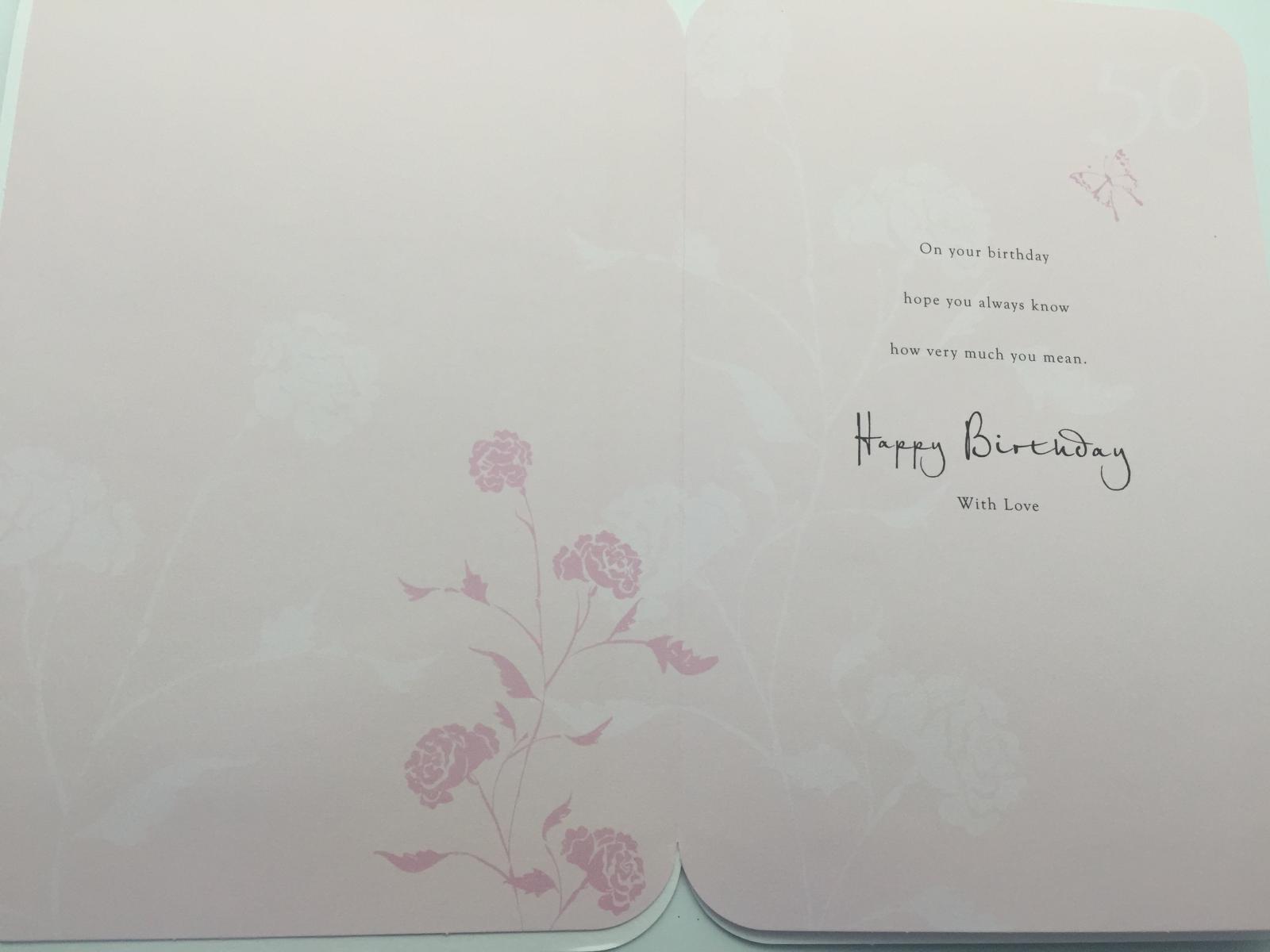 Mum Age 50 Birthday Greeting Card A contemporary Mum age 50 birthday card with a luxury colour insert. Wording on Front: For a special Mum on your 50th birthday. You're a special Mum in so many ways - your love and care make such a difference. Inside Verse: On your birthday hope you always know how very much you mean. Happy birthday with love. Finish: Matt. Dimensions: 210 x 140mm