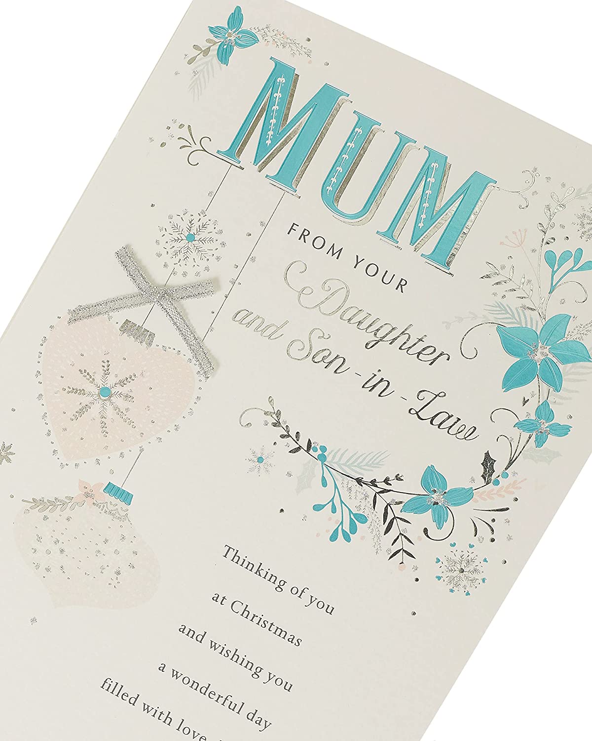 Wish Your Mum A Very Merry Christmas With This Gorgeous Christmas Card Especially From A Daughter And Son In Law Mum From Your Daughter And Son In Law. Thinking Of You At Christmas And Wishing You A Wonderful Day Filled With Happiness Sumptious Large Quality With Silver Foiled Finish, Added Jewels And 3d Embellishment Comes With Matching Envelope Approx. Size 260mm X 170mm