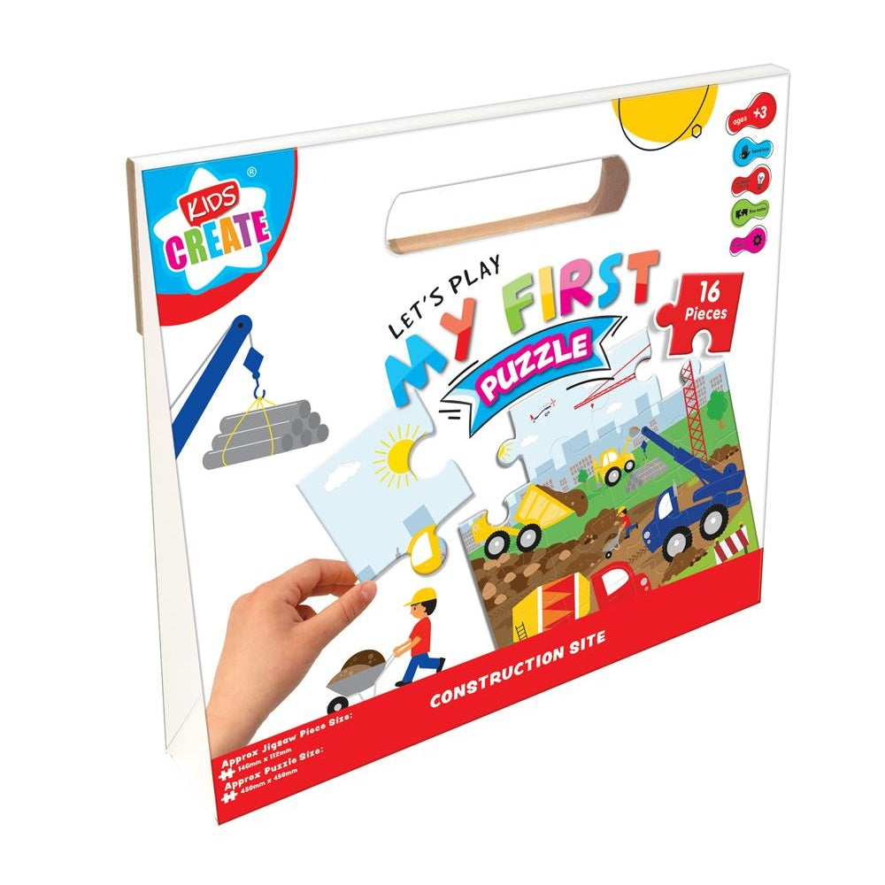 My 1st Puzzle Construction Site Design. Included 16 pieces. Approx puzzle size: 450mm x 450mm. Approx Jigsaw Piece Size: 146mm x 112mm. Good for Hand and Eye Coordination, Solving Problem, Fine motor and thinking skills.