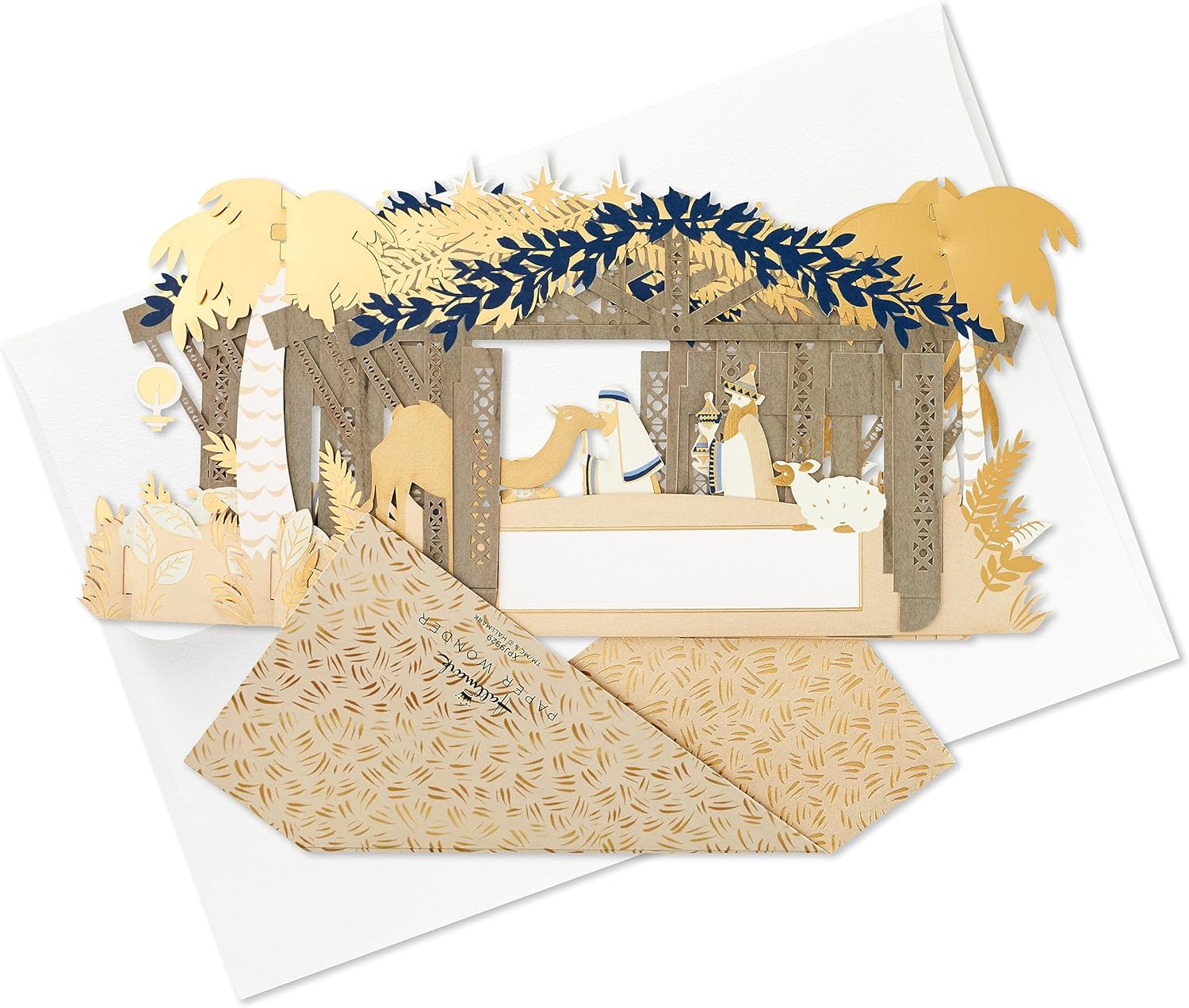 3D CHRISTMAS CARD: Spread Christmas cheer to those you love with this incredible 3D and pop-up display of the Nativity Scene card with stunning intricate details of this magical Christmas moment. The perfect gift from our Paper Wonder collection. NATIVITY SCENE CHRISTMAS CARD: This jumbo card pops-up into a 3D display of the Nativity scene with Mary, Joseph and the Baby Jesus and others on a base for display. This card features metallic gold foil details and a laser cut design HIGH QUALITY CONSTRUCTION & FULLY RECYCLABLE: This product is fully recyclable, and made of material from well-managed, FSC-certified forests and other controlled sources CHRISTMAS WISH: This Christmas card has space on the back for your own personal message, a Christmas wish or a happy memory you've shared together, the perfect way to send lots of love and festive blessings to your loved ones SIZE: This card measures 30.5cm by 22.8cm when flat and 14cm by 22.3cm by 9.5cm when constructed, and is accompanied with a Hallmark branded, white envelope. Within standard UK 'letter' size limits. The perfect size to display in their home