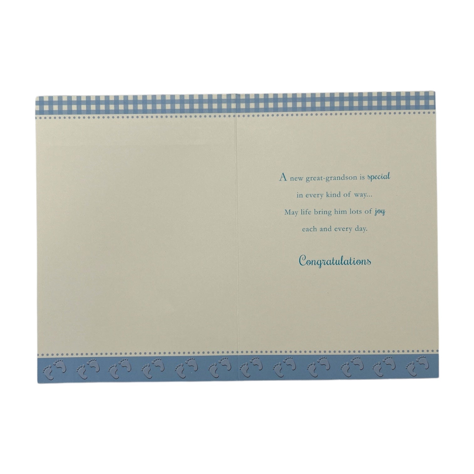 This is a Great-Grandson Birth Celebration greeting card, designed to congratulate the arrival of a new great-grandson. The card features a soft blue and cream color scheme with a charming gingham pattern. The card has a shimmer foil finish, giving it an elegant and eye-catching look that enhances the lettering and design details. It comes complete with a coordinating envelope. Card size: Approx. 19.5 x 14 cm.