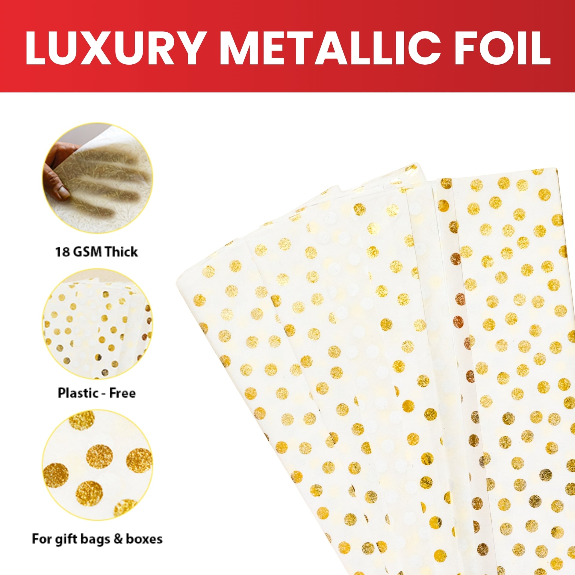 Pack of 10 Polka Dots Luxury Gold Metallic Plastic-Free 18gsm Tissue Paper Sheets 50x70cm - Patterned Tissue Paper for Xmas, New Year, Party, Wedding, Birthday Packing Present Gift Box DIY Art Crafts