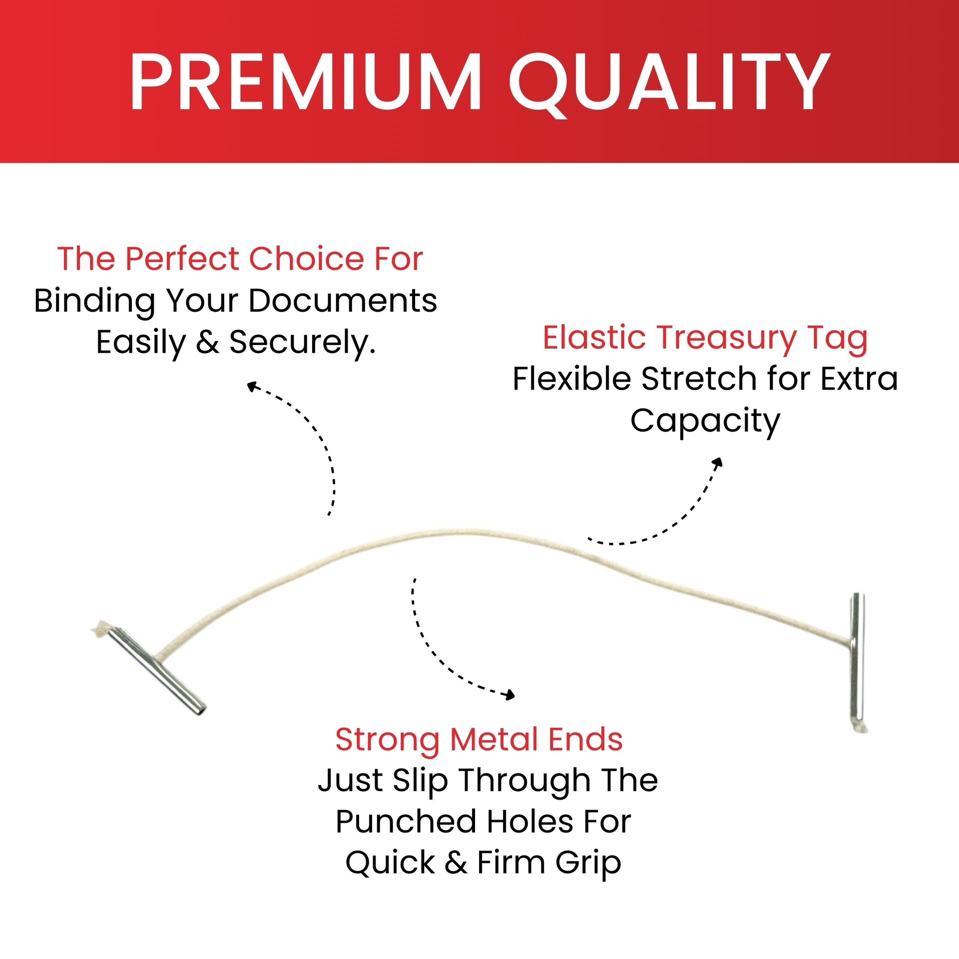 Pack of 100 Elastic White 125mm Metal End Treasury Tags. Organize your documents with ease using this pack of 100 Elastic White Metal End Treasury Tags. Whether you're sorting paperwork at the office, filing important documents at home, or keeping your school projects in order, these durable and reliable treasury tags are the perfect solution. Crafted from high-quality metal, these treasury tags are designed to withstand frequent handling and ensure long-lasting use. Each tag features a sturdy metal end that securely holds your documents together, preventing them from getting misplaced or damaged. With a pack of 100 tags, you'll have an ample supply to tackle various organizational tasks. The convenient bulk packaging ensures you always have treasury tags on hand whenever you need them, saving you time and hassle. These metal end treasury tags offer versatility, allowing you to bind papers of various sizes and thicknesses effortlessly. Whether it's loose sheets, reports, presentations, or artwork, these tags provide a simple yet effective solution for keeping your documents neat and tidy. Ideal for professionals, students, teachers, and anyone who values organization, this pack of 100 Elastic White Metal End Treasury Tags is a must-have accessory for any workspace or study area. Say goodbye to clutter and hello to streamlined organization with these reliable and convenient treasury tags.