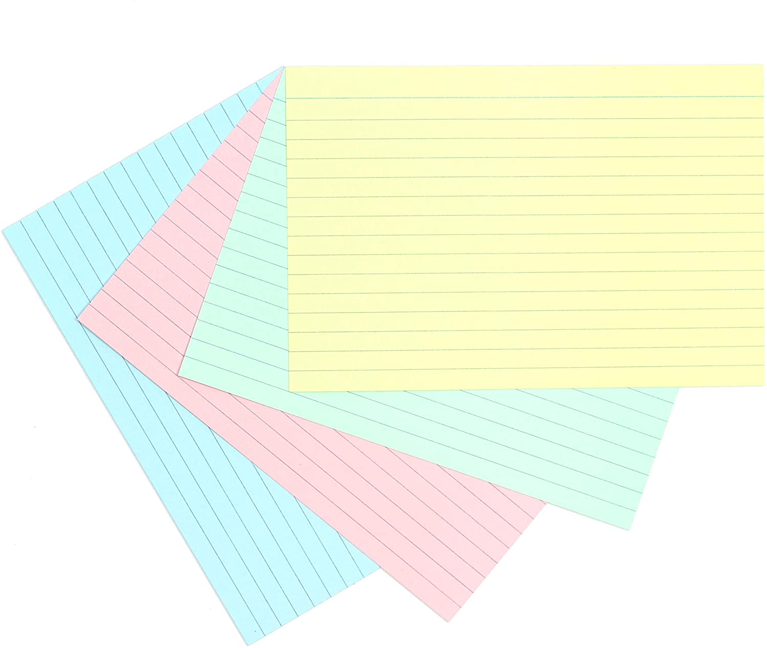 6x4" Record Cards by Silvine. 100 assorted coloured cards (Blue, Pink, Green, Yellow) ruled feint with headline measuring 152 x 101mm