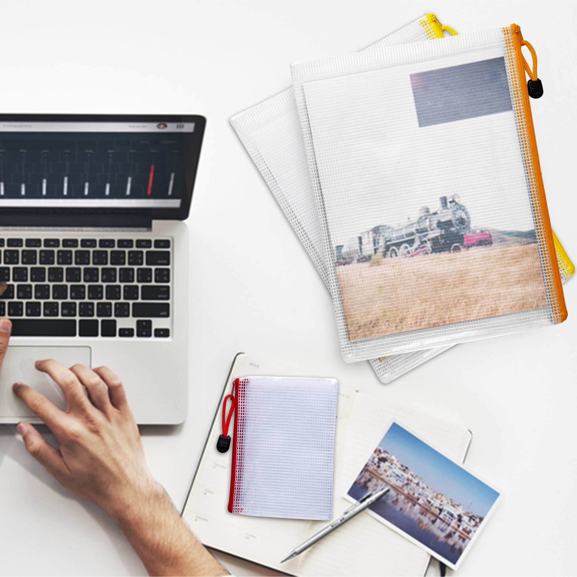 Pack of 12 A5 Blue PVC Mesh Zip Bags. Made from durable PVC with white mesh. Mesh bags ideal for documents, stationery and other items. Durability allows it to be used many times. Ideal for home, school and office use. Coloured zipper with hang rope for easy open and closure. Size: 230x175mm. Thickness 250microns. Available in a range of colours and sizes from the Janrax range.
