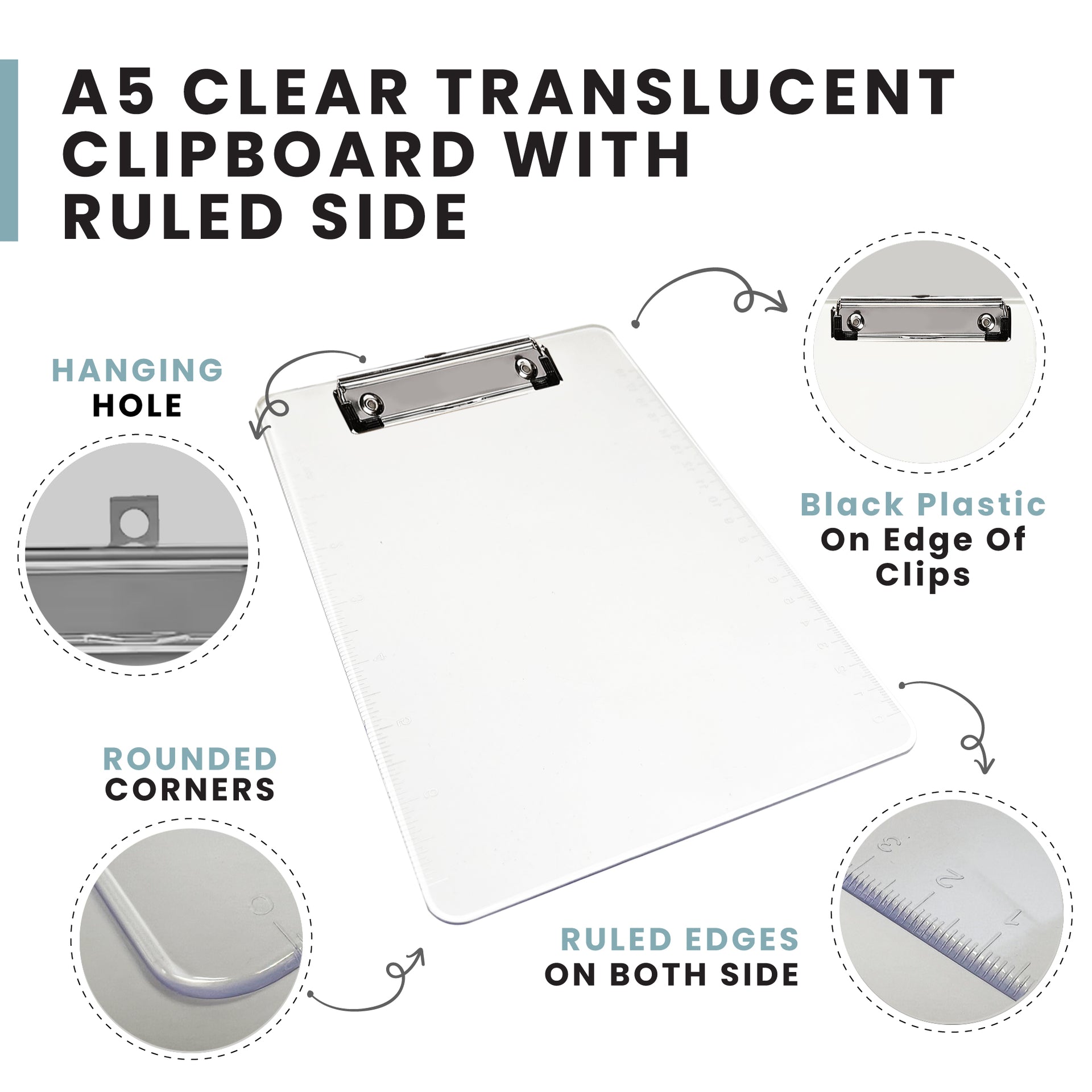 Pack of 12 Quality A5 Clear Translucent Clipboard. Includes a Ruled edges on both side. Size of Clipboard: 226mm x 150mm. Includes Hanging Hole. Black Plastic on Edge of Clips to keep documents safe.