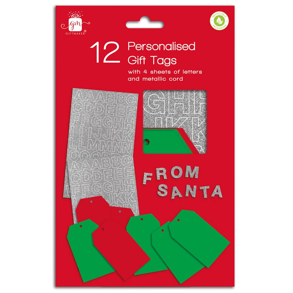 Pack of 12 Personalised Christmas Tags. Includes Tags with 4 sheets of letters and metallic cord.