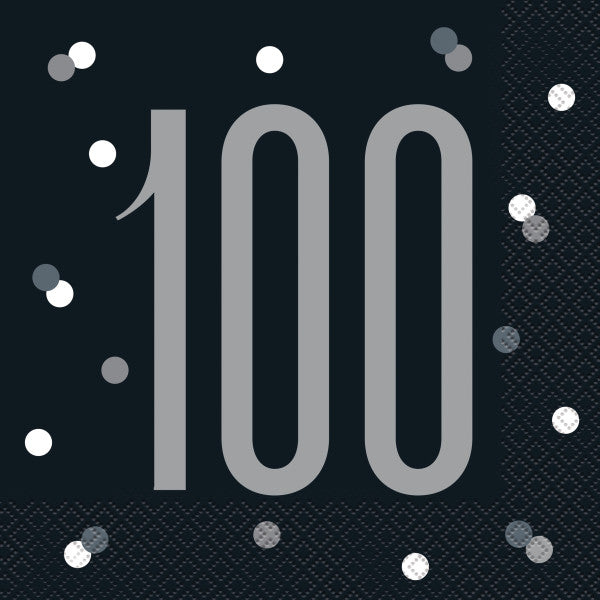 Pack of 16 Birthday Black Glitz Number 100 Luncheon Napkins. Put the finishing touch on your party table setting with these luncheon napkins. These napkins feature a number "100" text and dots design in black background. Make cleanup a breeze with disposable paper napkins.