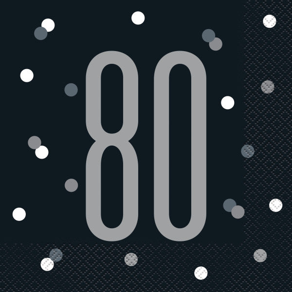 Pack of 16 Birthday Black & Silver Glitz Number 80 Luncheon Napkins. Put the finishing touch on your party table setting with these luncheon napkins. These napkins feature a number "80" text and dots design in black background. Make cleanup a breeze with disposable paper napkins.