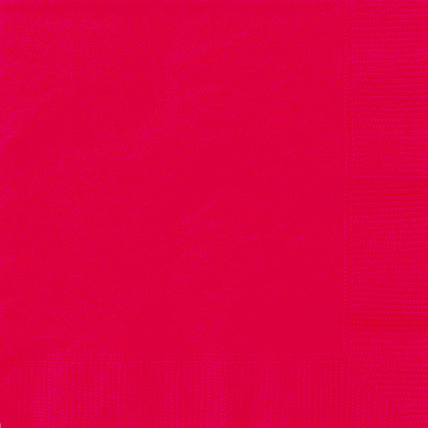 Pack of 20 Ruby Red Solid Luncheon Napkins. 2-Ply Red Party Napkins measure 6.5" x 6.5" (16.5cm x 16.5cm). Ideal for serving small snacks, protecting surfaces or wiping up spills at a birthday party, wedding, Christmas party or Valentines party. Paper serviettes make your after party clean-up really quick and easy.
