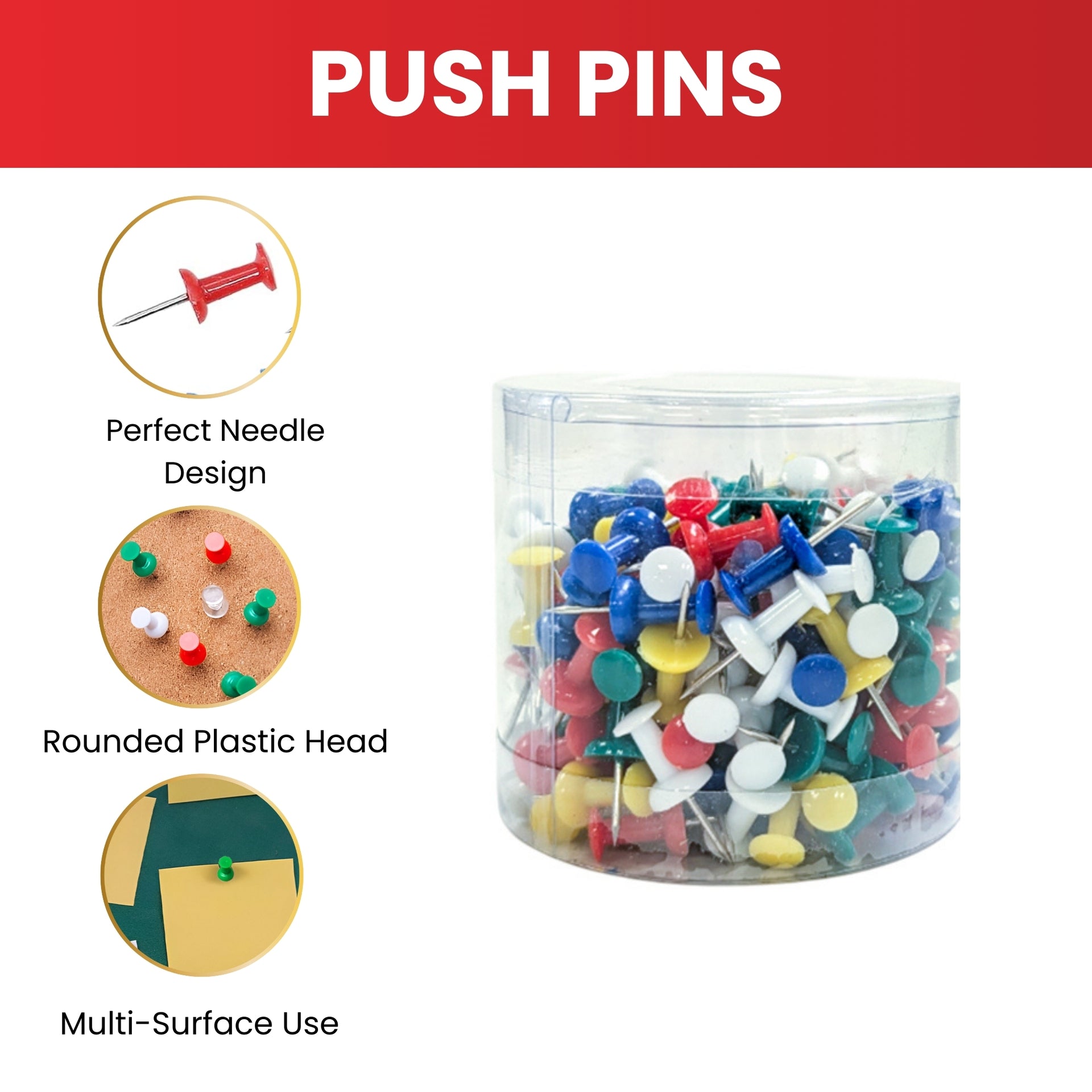 Pack of 200 Assorted Coloured Push Pins in Tub by Janrax. Colours include Red, Green, White, Yellow and Blue. In tub for easy storage.