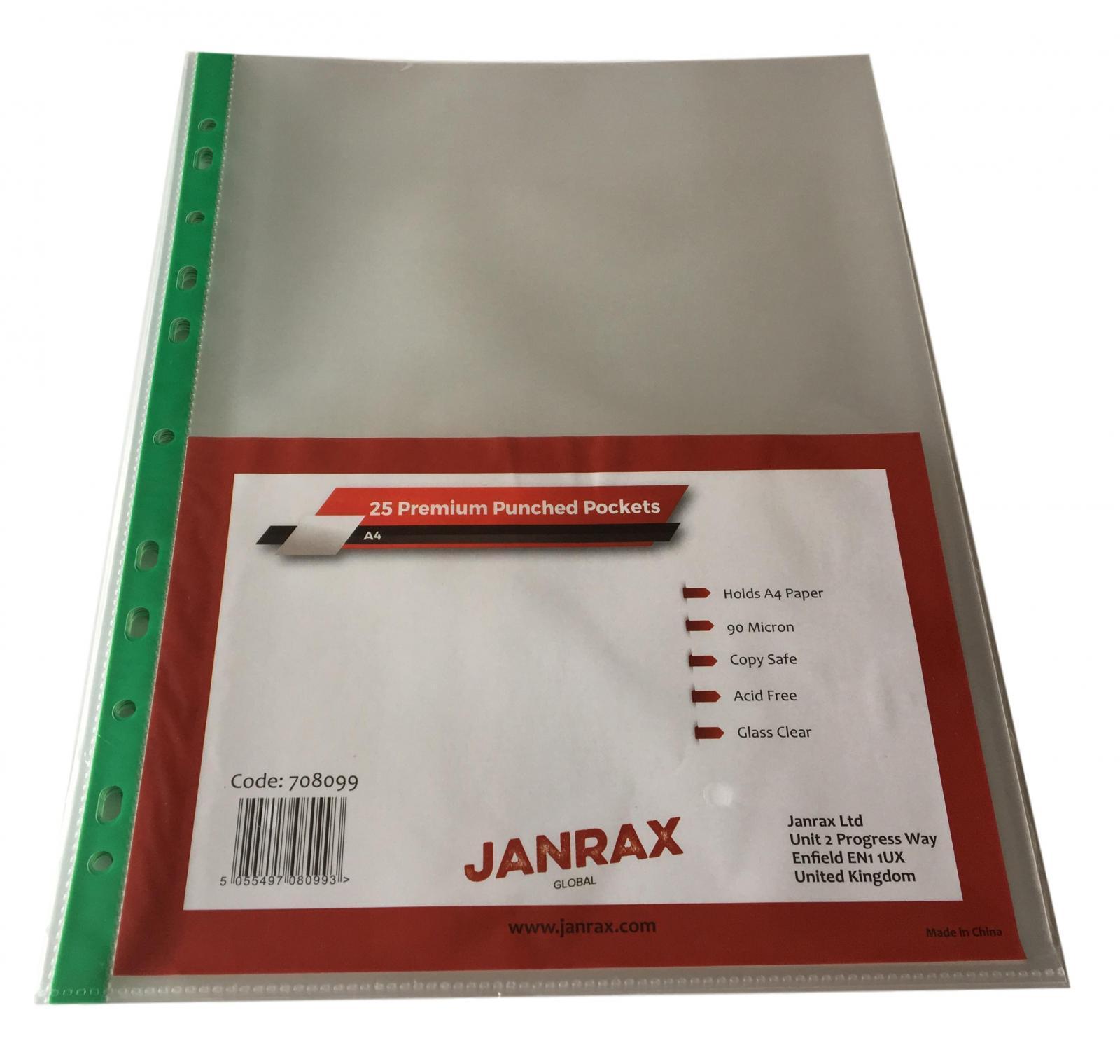 Pack of 25 Premium A4 Glass Clear Punched Pockets by Janrax. Elevate your organizational game with our Pack of 25 A4 Premium Glass Clear Punched Pockets. Crafted to perfection, these pockets are meticulously designed to provide unparalleled clarity and durability for all your document storage needs. Each pocket is precisely sized to accommodate A4-sized papers, ensuring a perfect fit without any creases or folds. The premium glass-clear material offers crystal-clear visibility, allowing you to showcase your documents with utmost clarity and professionalism. Constructed from high-quality 90-micron polypropylene, these punched pockets are exceptionally strong and tear-resistant, providing long-lasting protection for your important papers. Whether it's for office presentations, school projects, or archival purposes, these pockets offer reliable protection against spills, tears, and everyday wear and tear. The reinforced binding edges and multi-punched holes ensure secure and hassle-free integration into your binders or files, keeping your documents neatly organized and easily accessible. With a generous pack of 25 pockets, you'll have an ample supply to tackle all your filing and storage needs efficiently. Upgrade your filing system with confidence and invest in our Pack of 25 A4 Premium Glass Clear Punched Pockets today. Experience the ultimate combination of clarity, durability, and convenience for all your document management requirements.