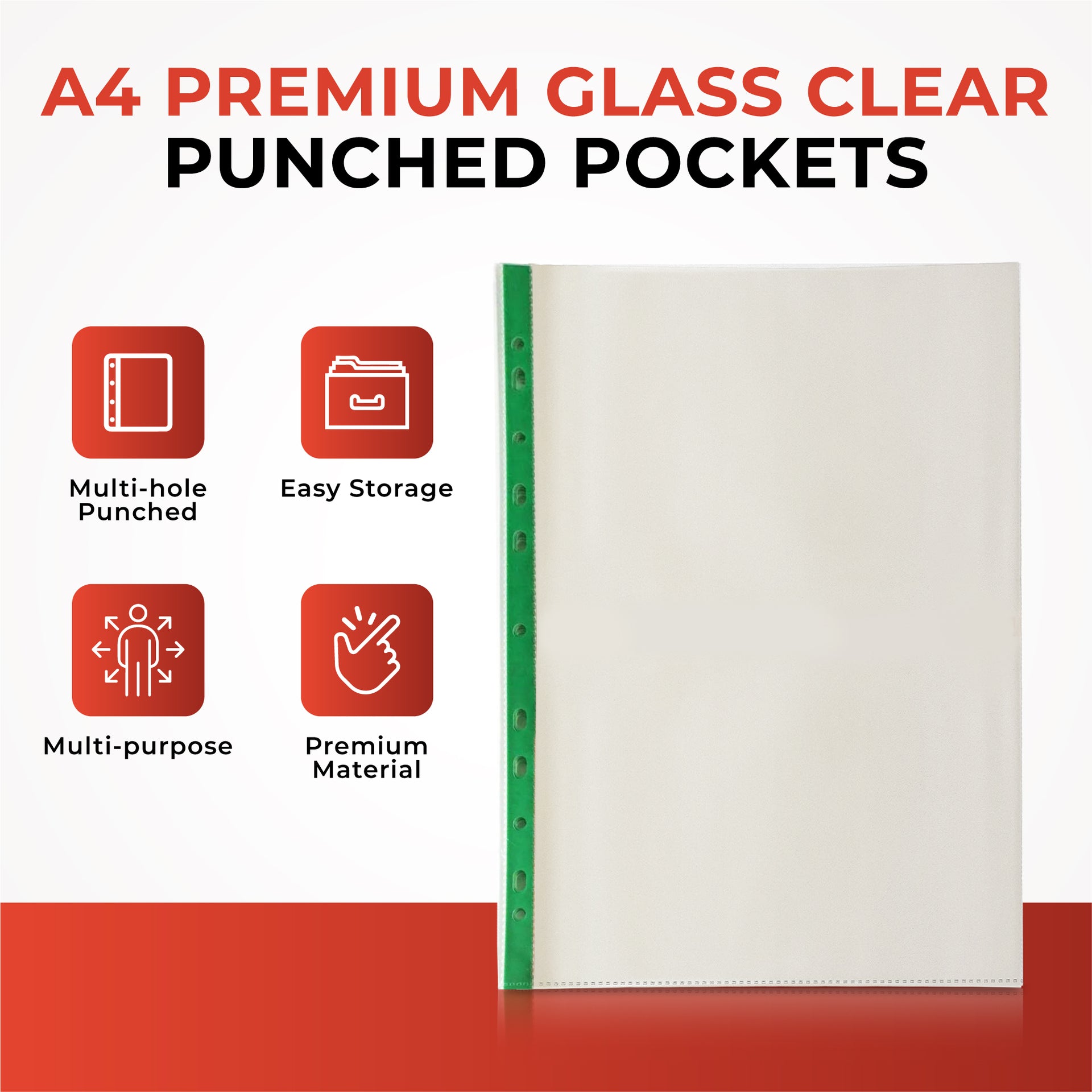 Pack of 25 A4 Premium Glass Clear Punched Pockets (90 Micron)