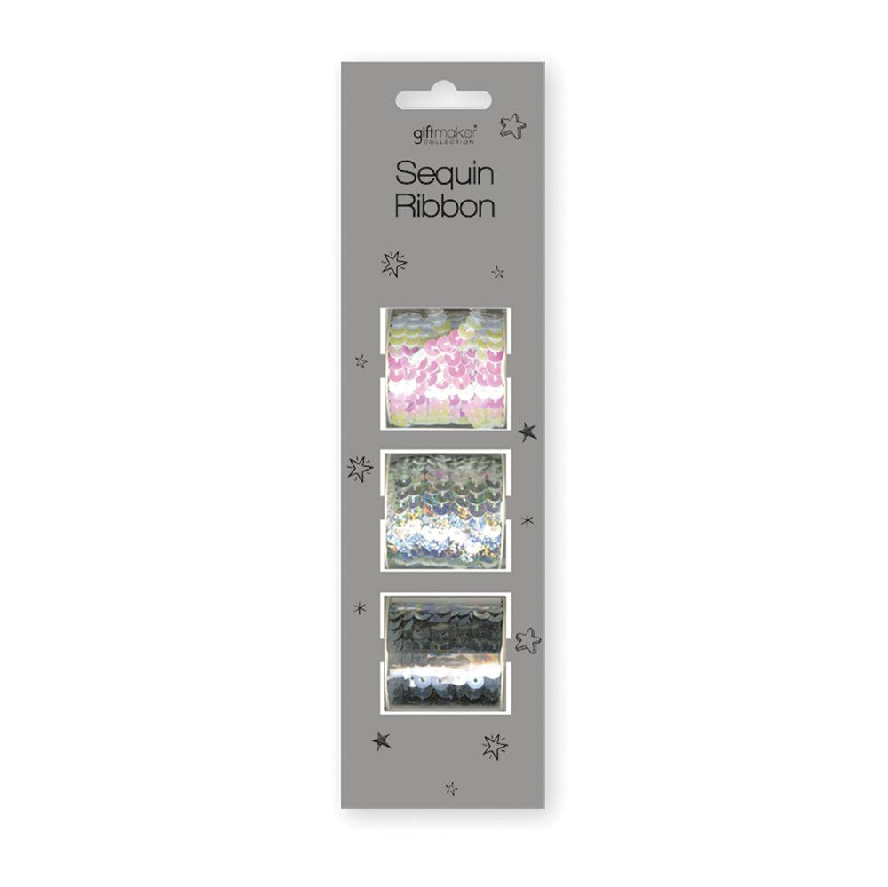 Pack of 3 2m Sequin Reels. Three colours: White, Silver, Grey.