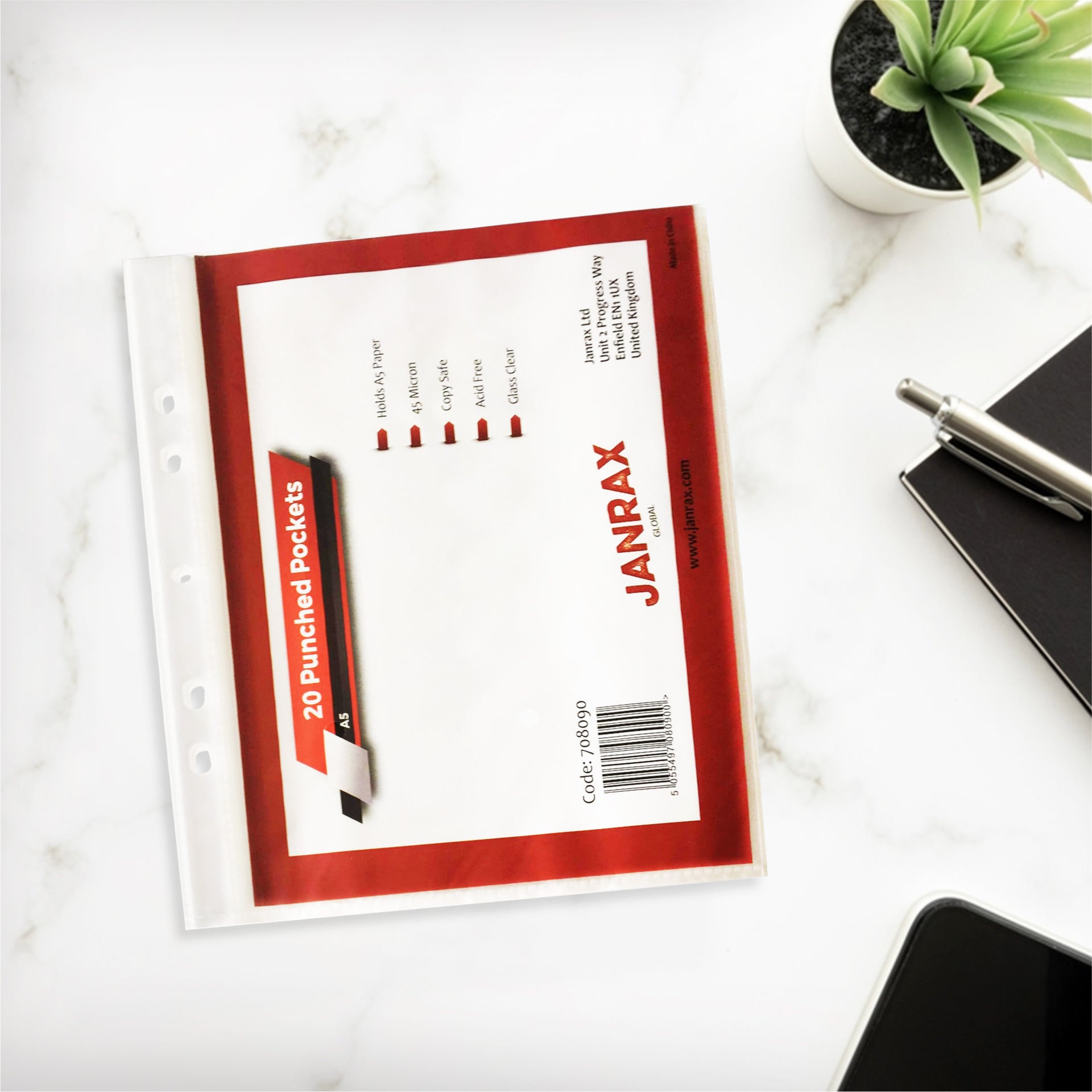 Pack of 500 A5 Glass Clear Punched Pockets by Janrax. Transparent with white reinforced strip for extra strength. Spines are multi-hole punched to fit any filing or portfolio system. Holds A5 Paper, Top Opening. 45 Micron. Copy Safe, Acid Free.