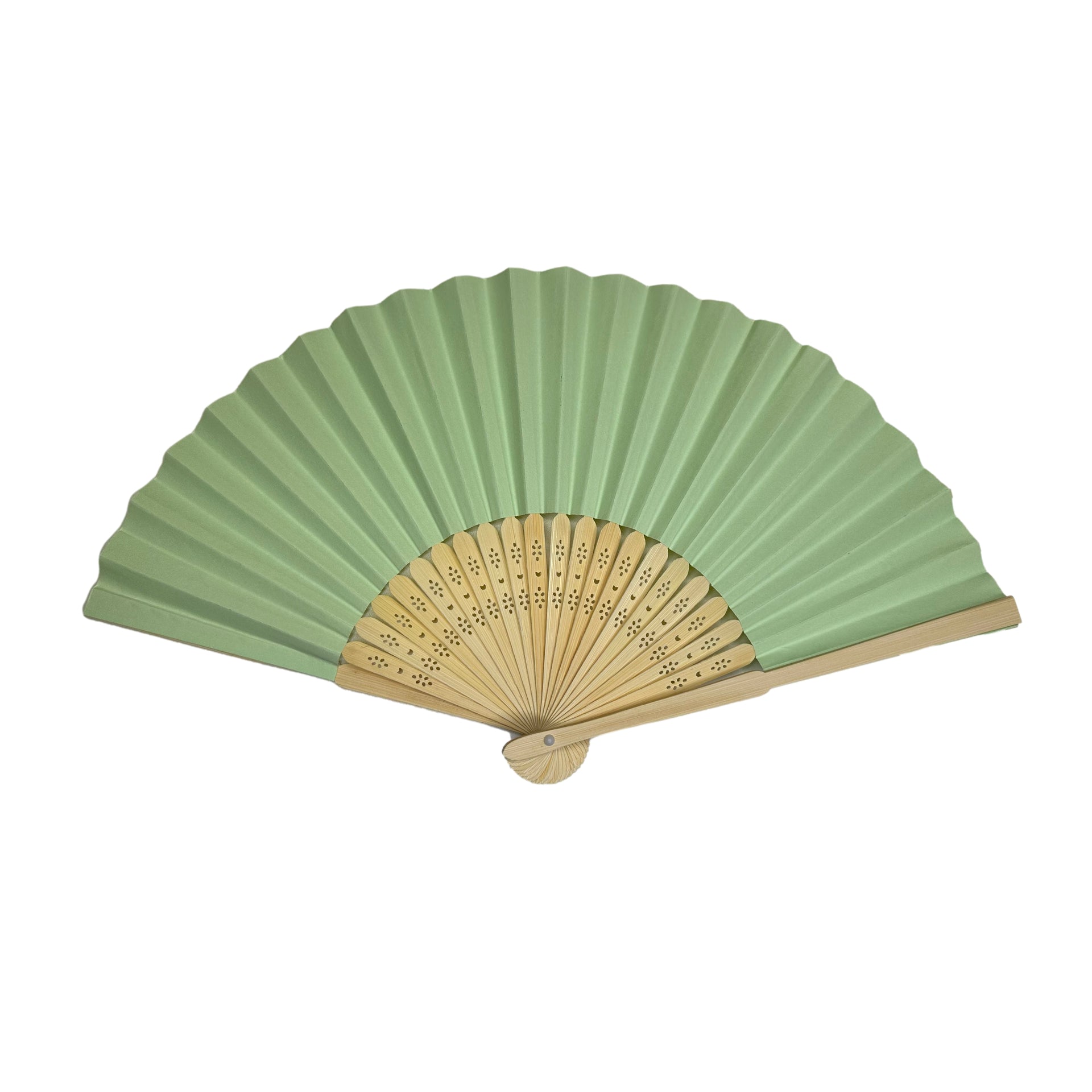 Light Green Paper Foldable Hand Held Bamboo Wooden Fan by Parev. With 23 Pieces of Bamboo Ribs. Size open: 21cm x 37cm approx. Great for decorations, weddings and summer events to keep cool. Perfect for indoor and outdoor events. The fans are easy to use and can be opened and closed with a simple flick of the wrist. The bamboo handle is lightweight and comfortable to hold, making it easy to carry with you wherever you go. Available in a wide range of colours from the Parev range.