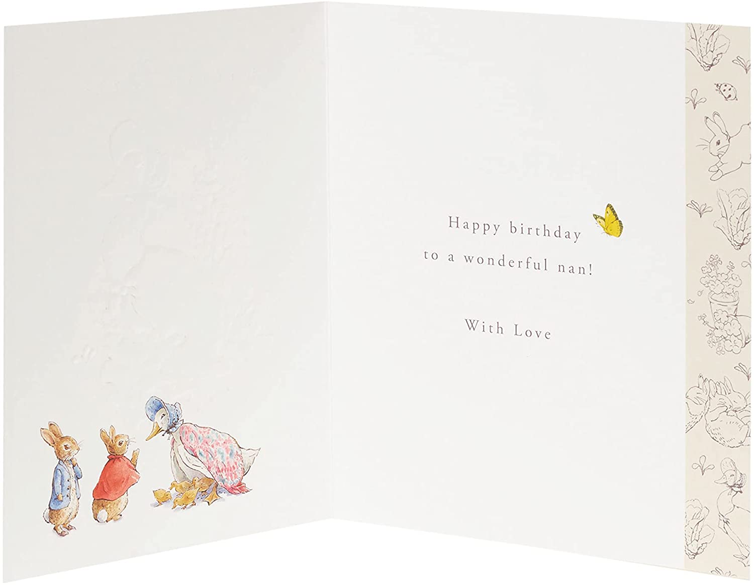 Wish Nan a happy birthday with this cute Peter Rabbit card, elegantly decorated with gold foil finishes. Inside Message Reads: Happy birthday to a wonderful nan! With Love. Card Size: 159 x 184mm. Envelope Included.