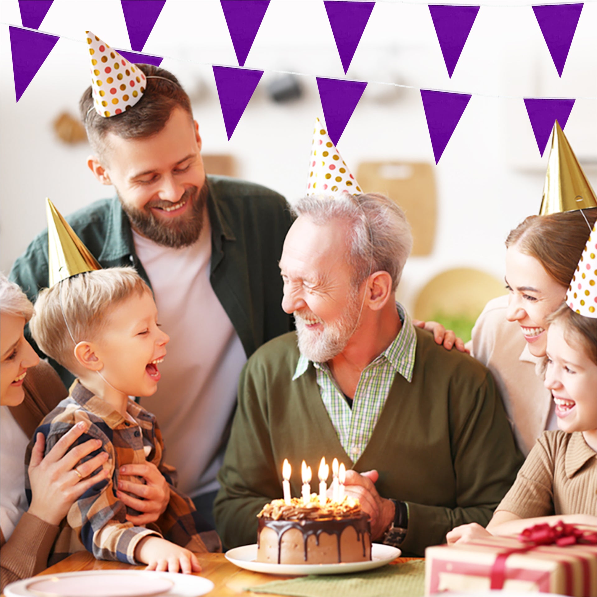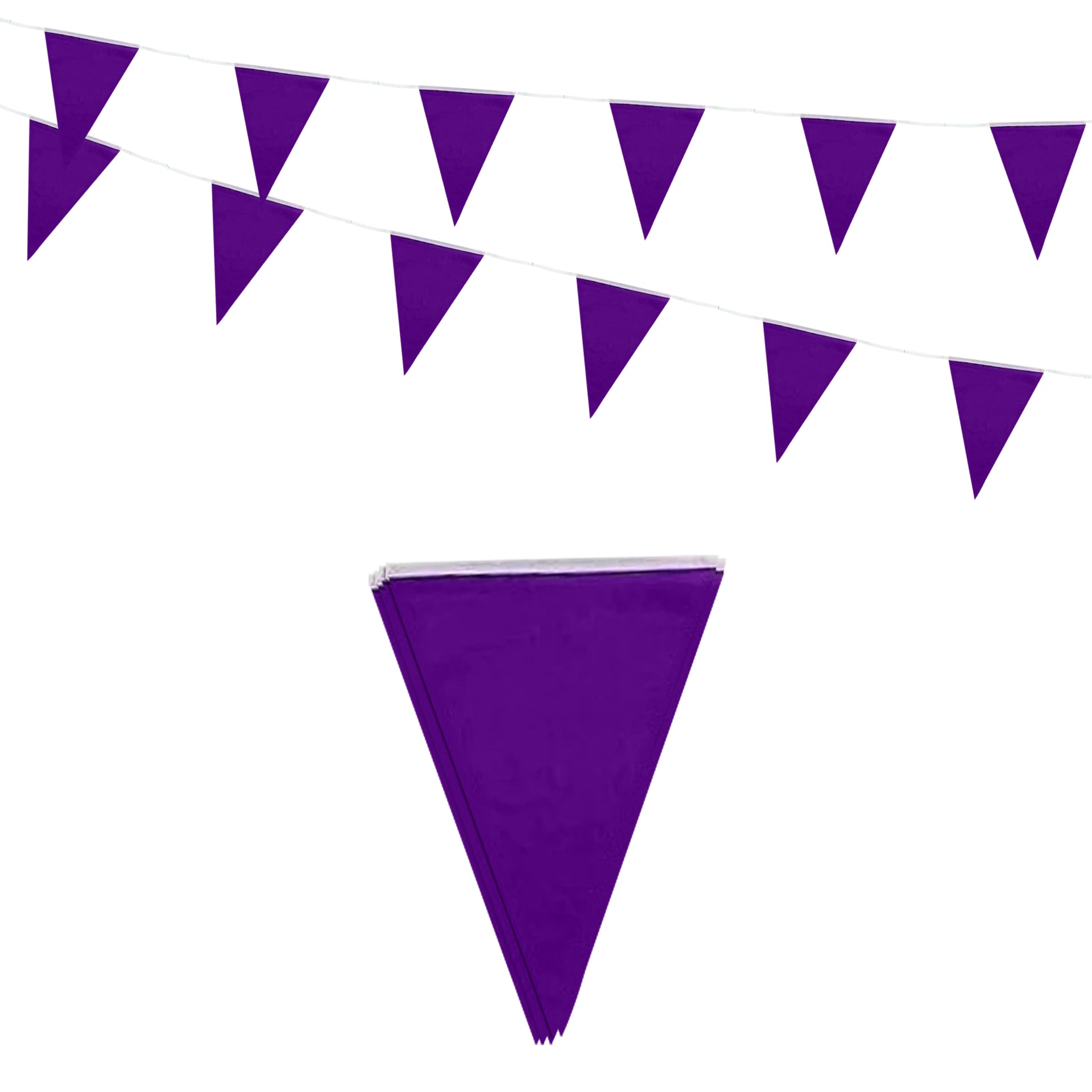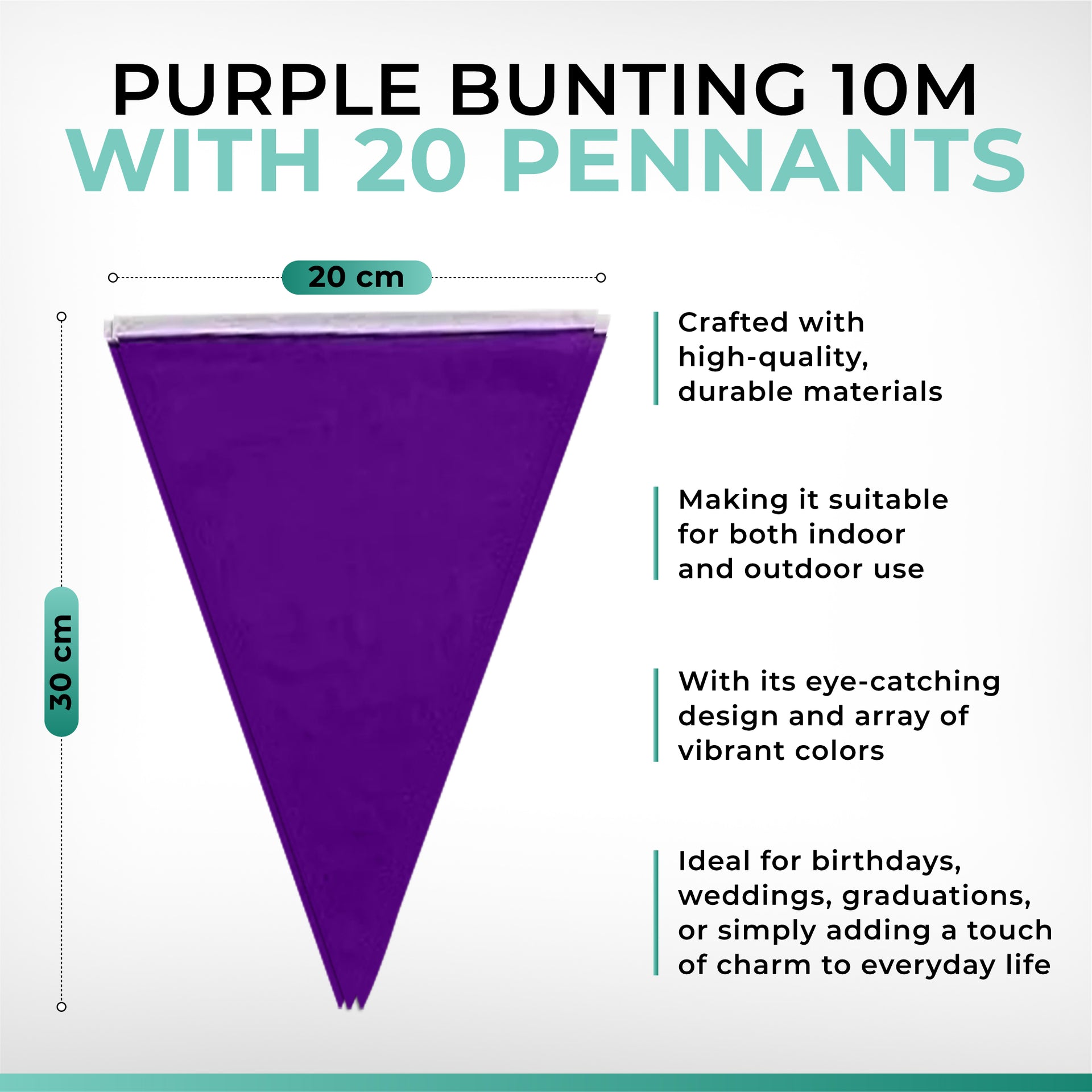 Purple Bunting 10m with 20 Pennants. This bunting measures 10m and has 20 pennants. Material: PVC. Approx size of each Flag/ Pennant 30x20cm.