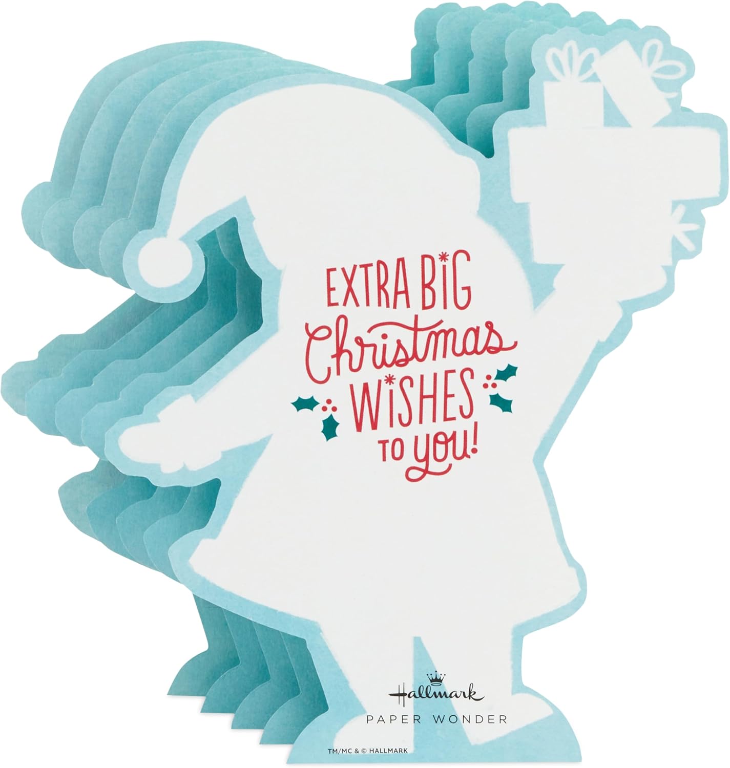 Send them a Christmas card they'll adore year after year with this exciting 3D and pop up card from Hallmark. Celebrate the festivities with laughter and have a merry time with their favourite Christmas icons. Light up their Christmas with a card they'll adore. This card pops up into a 3D display of Santa holding presents, features metallic gold foil details, die-cut details and will provide lots of holly, jolly fun this Christmas. This card is fully recyclable, and made of material from well-managed, FSC-certified forests and other controlled sources FESTIVE MESSAGE: With space to add your own special message to wish them well this festive season and accompany it with our message 'Extra big Christmas wishes to you!' The perfect way to send them a heartfelt wish and make their day extra special. CARD SIZE: This card measures 22.8cm by 15.9cm, constructed card measures 15.5cm by 12.4cm by 5cm, perfectly sized to display in their home or post in the mail. This card is accompanied with a Hallmark branded, bright red envelope. Within UK 'Large Letter' Postage Size Limits.