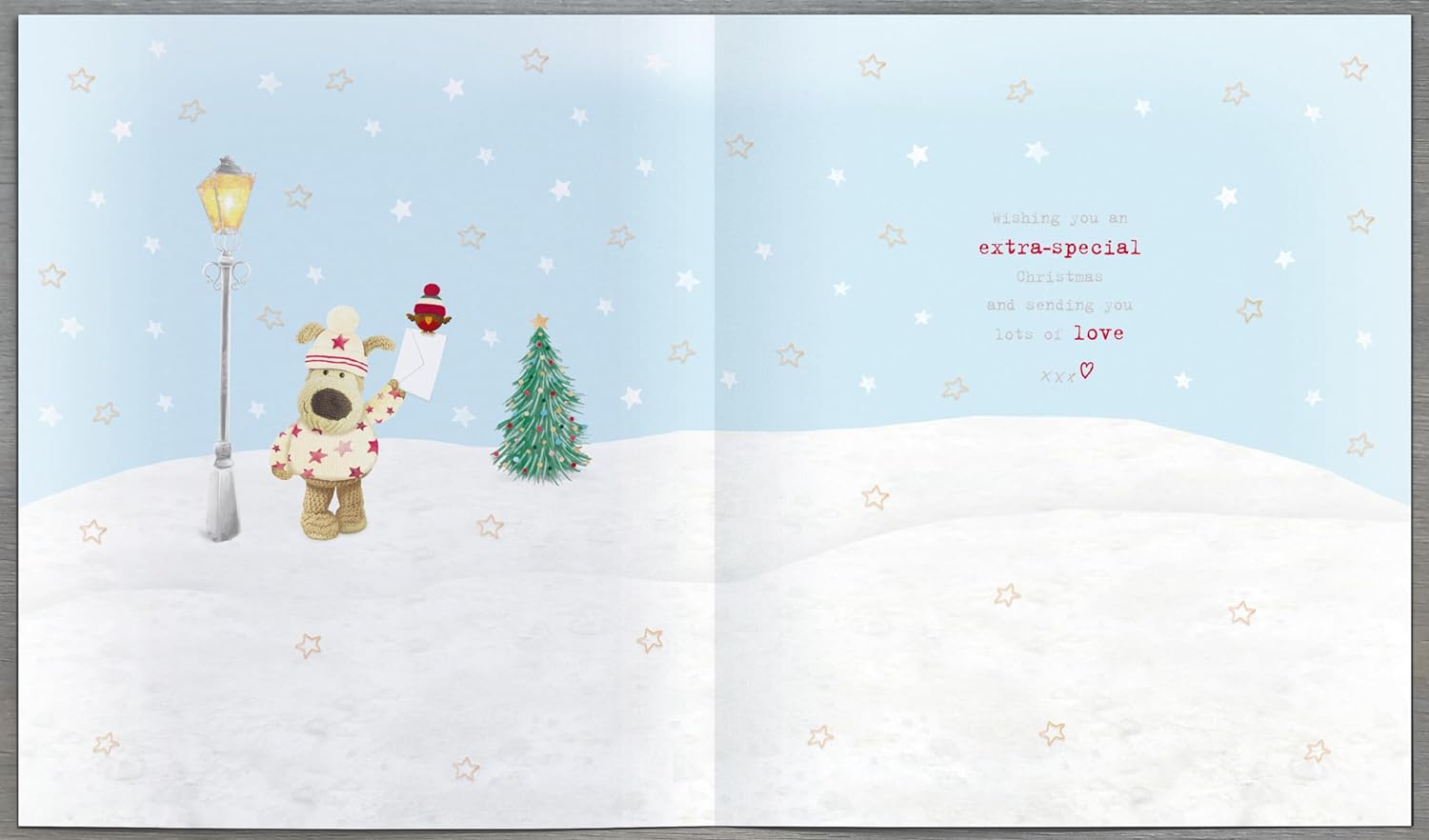 You are viewing: A Christmas greeting card from Across The Miles. Occasion: Perfect for Christmas. Message Inside: Wishing you an extra-special Christmas and sending you lots of love xxx Details: A cute greeting card from the popular Boofle range featuring the lovable dog Boofle and finished with gold foil detailing. Good to know: Made from card sourced from sustainable forests each card comes free of any plastic wrapping and complete with an envelope. Size: 184 x 159mm.