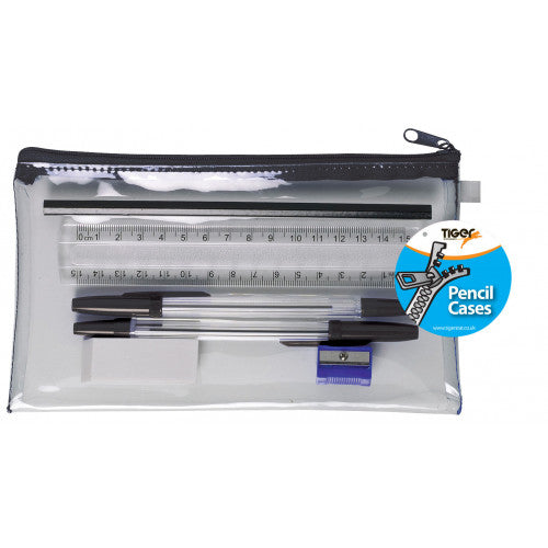 Clear (Exam style) 8 x 4inch/20 x 10cm pencil case with clear insert holding: 6in/15cm rule, HB Pencil, 2 ball point pens, pencil sharpener and eraser.
