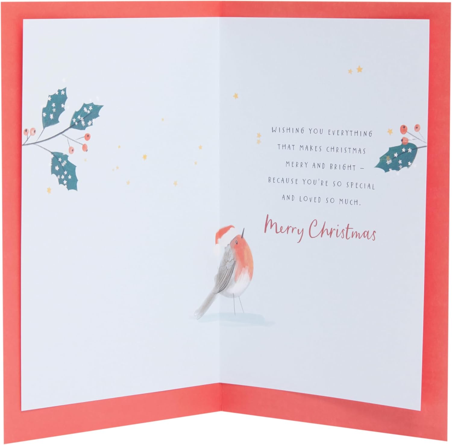 At Christmas, send a special son this card, illustrated with a snowy robin scene which is accented with gold foil finishes and printed on premium quality board. Message Inside Reads: Wishing you everything that makes Christmas merry and bright - because you're so special and loved so much. Merry Christmas Card Size: 14.9cm x 22.9cm | Envelope Included